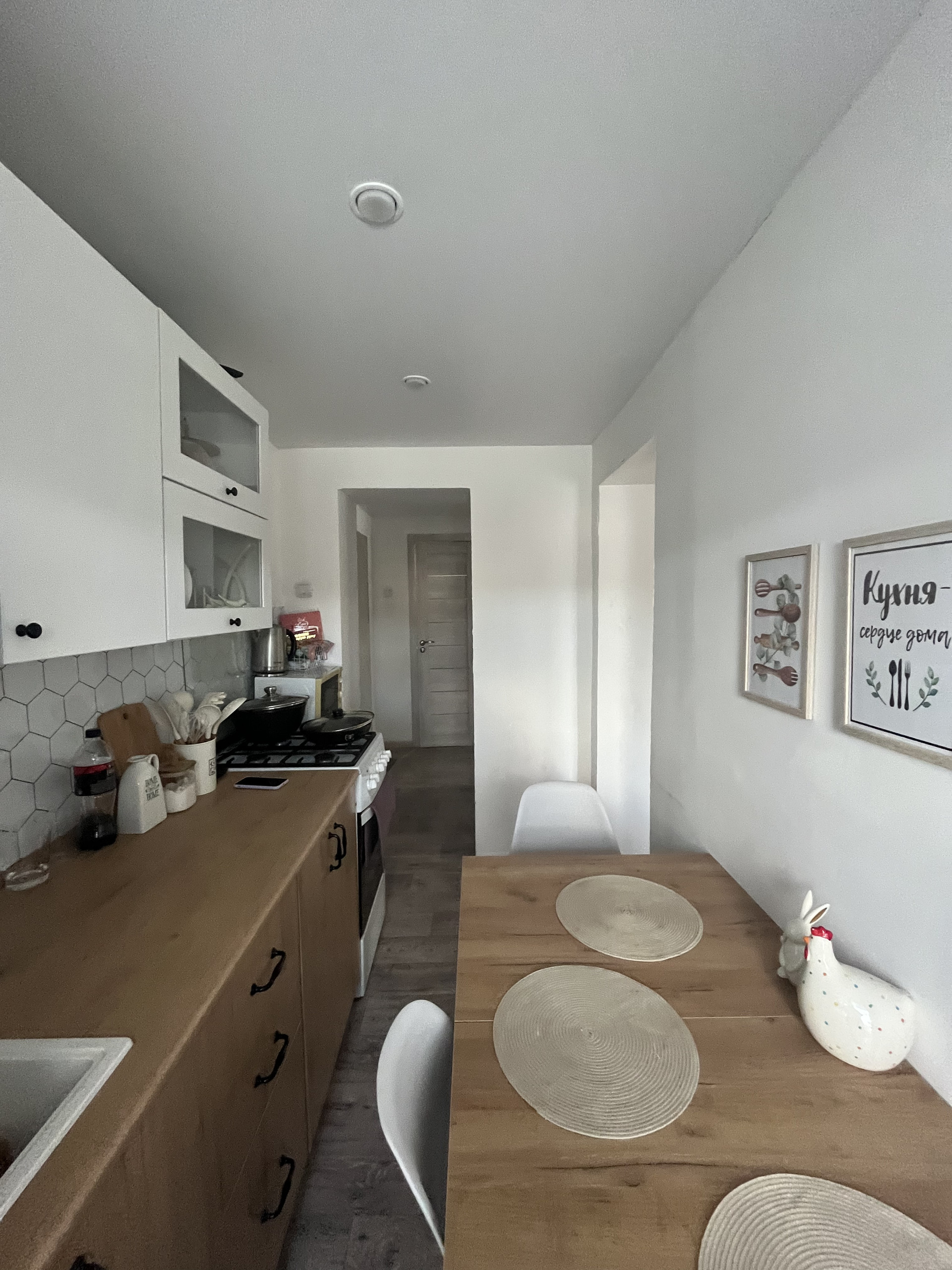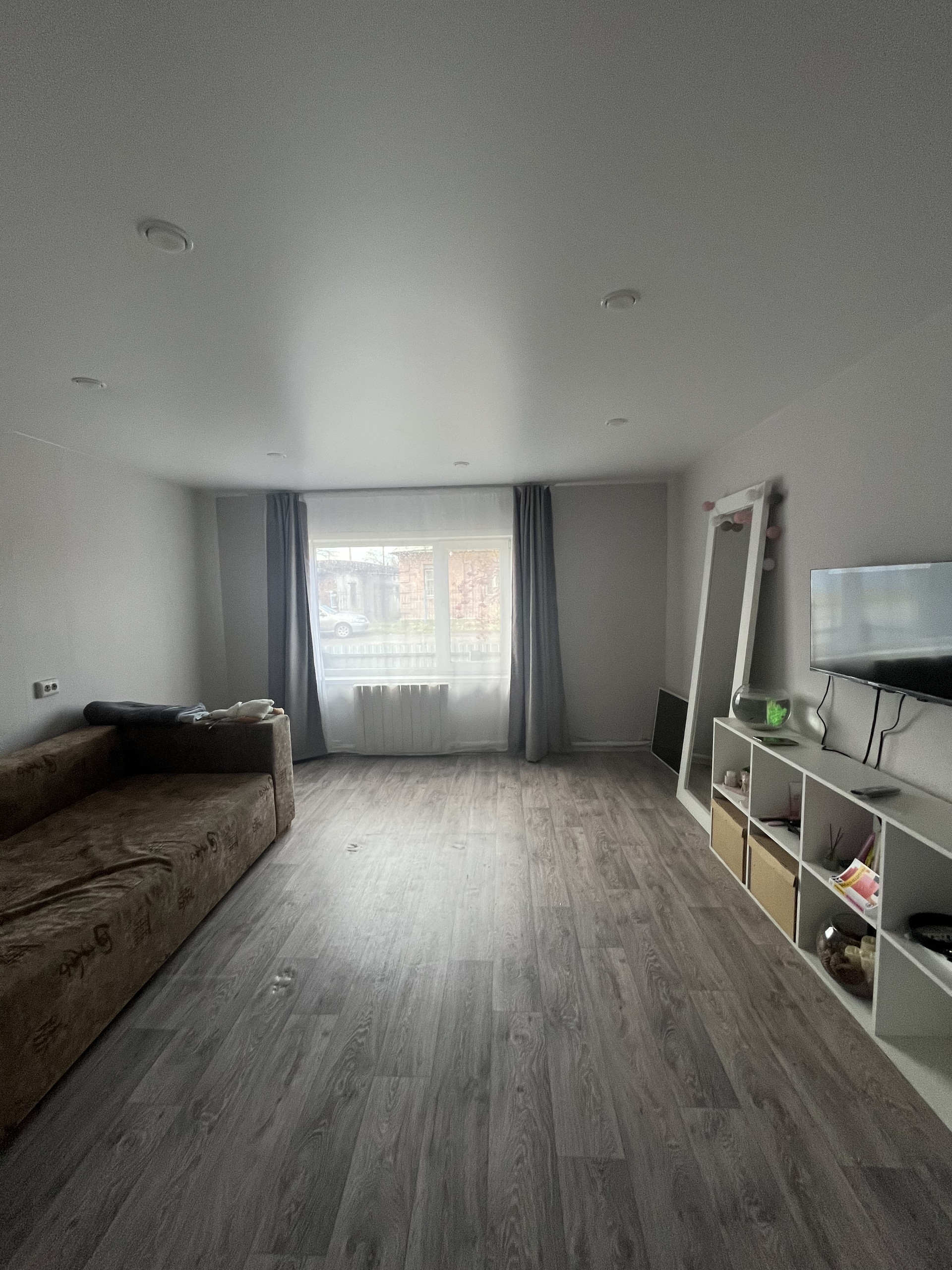 -Стены выровнены натяжные потолки.