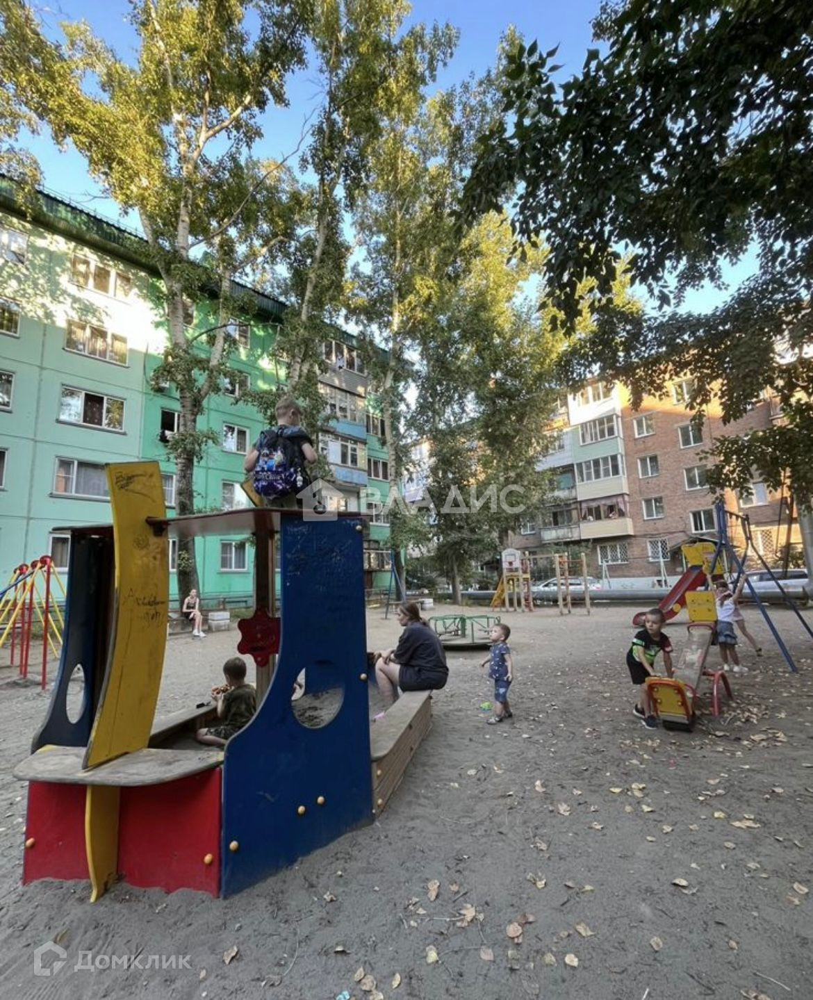 Хороший двор с детской площадкой и местом для парковки.