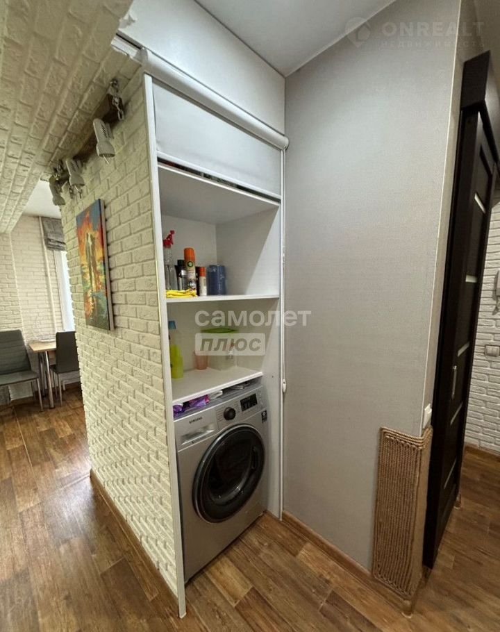Мебель и встроенная техника остаётся новому собственнику: современный кухонный гарнитур с встроенной посудомоечной машинкой, варочной панелью и духовым шкафом, кухонный стол со стульями, стиральная машина, прихожая, двухспальная кровать.