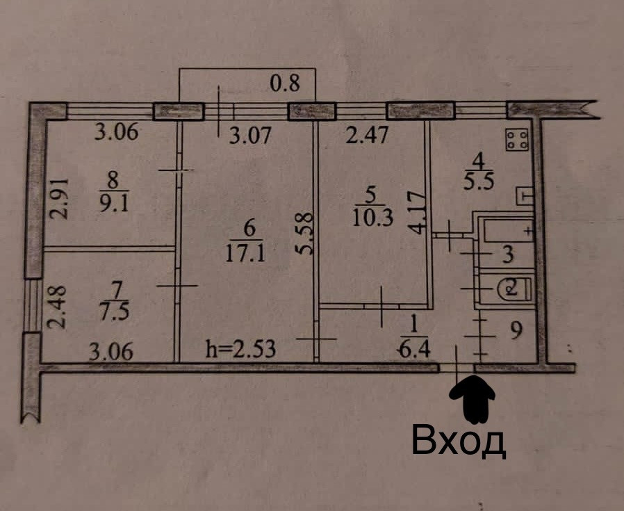 Высота потолков 2.53 м