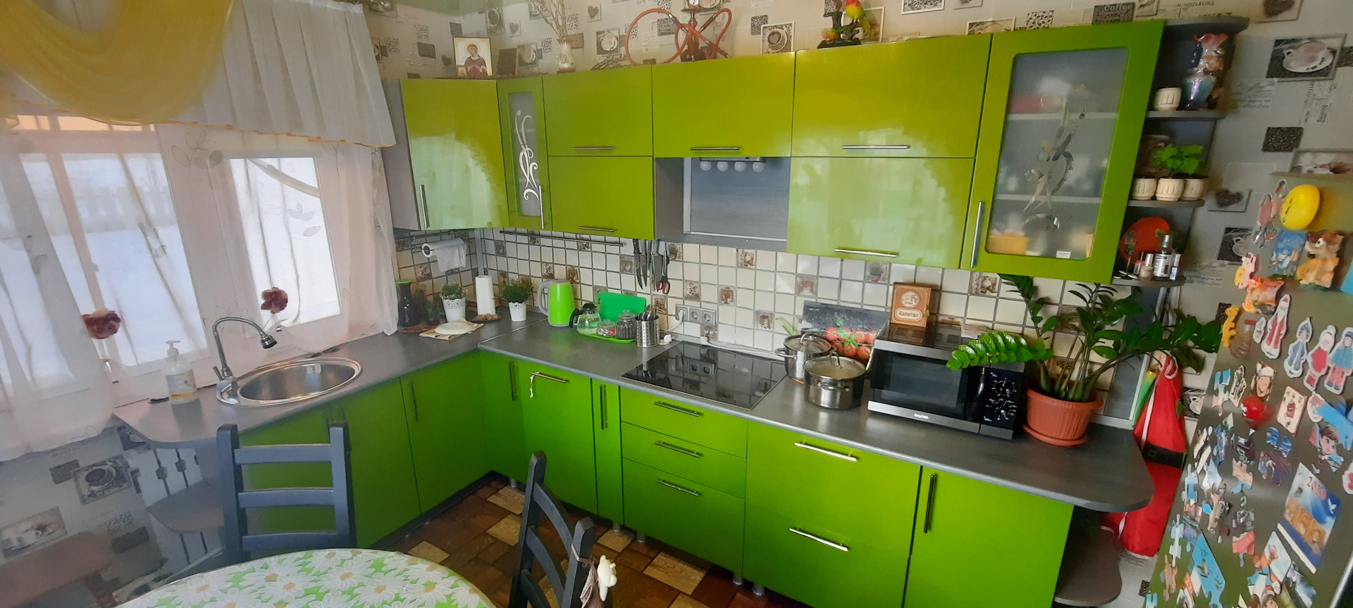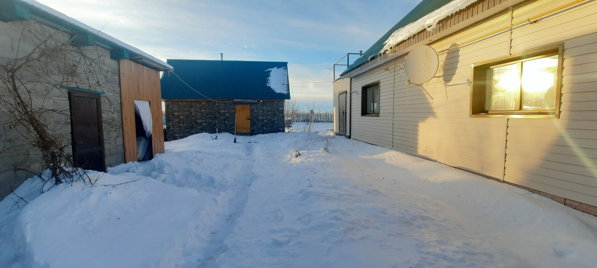 Земля очень плодородная. Из плодовоягодных насаждений – яблони, груша, ремонтантная малина, ежевика, виноград, виктория. В летнее время весь двор благоухает в цветах, дорожки к бане и гаражу отсыпаны мелкой щебенкой, а перед террасой выложена плитка.