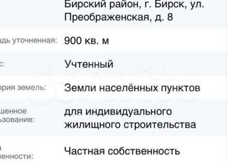 Я продаю бирского района ул. ПРЕОБРАЖЕНСКАЯ Д. 18 площадь 900+/-11кв.м |