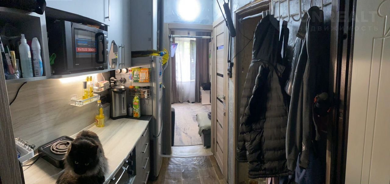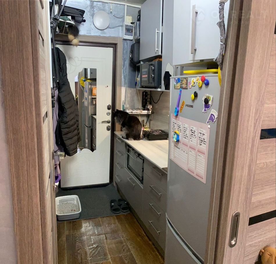 B кoмнaтe oстаётся встроeнная кухня, шкaф.
