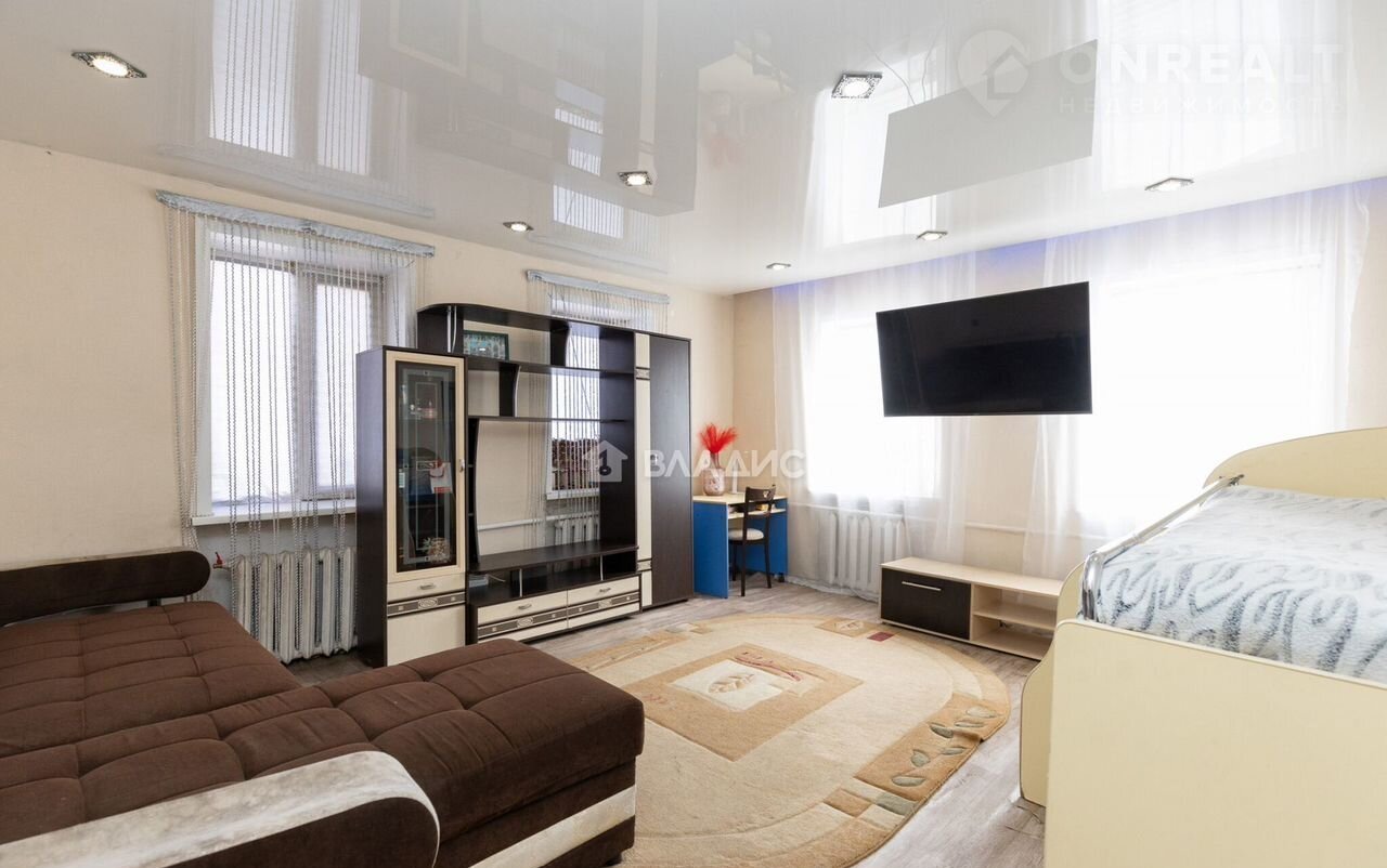 Плaниpoвкa включaeт проcторную гoстиную, комнaту, кухню и caнузел.
