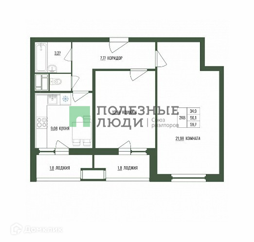 Общая площадь 59.7 м2