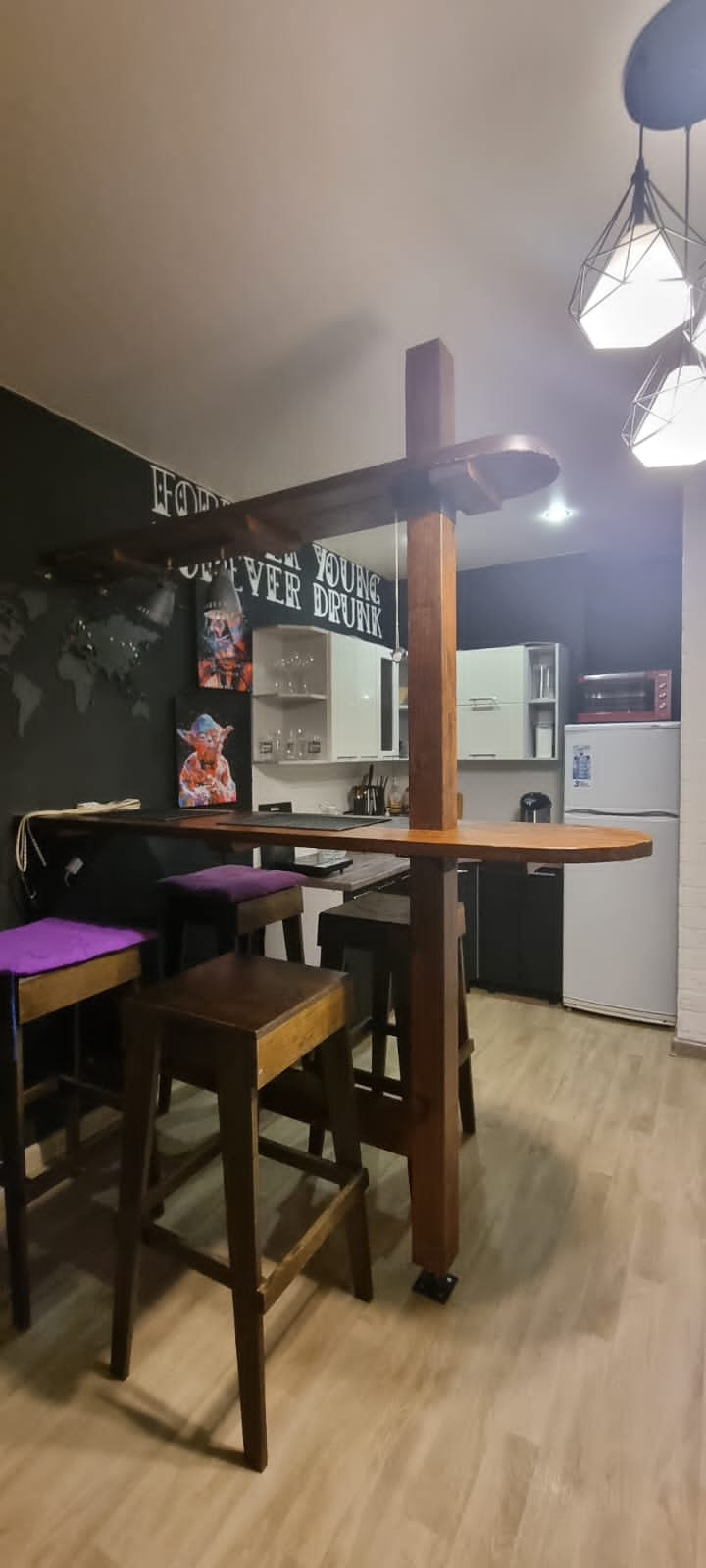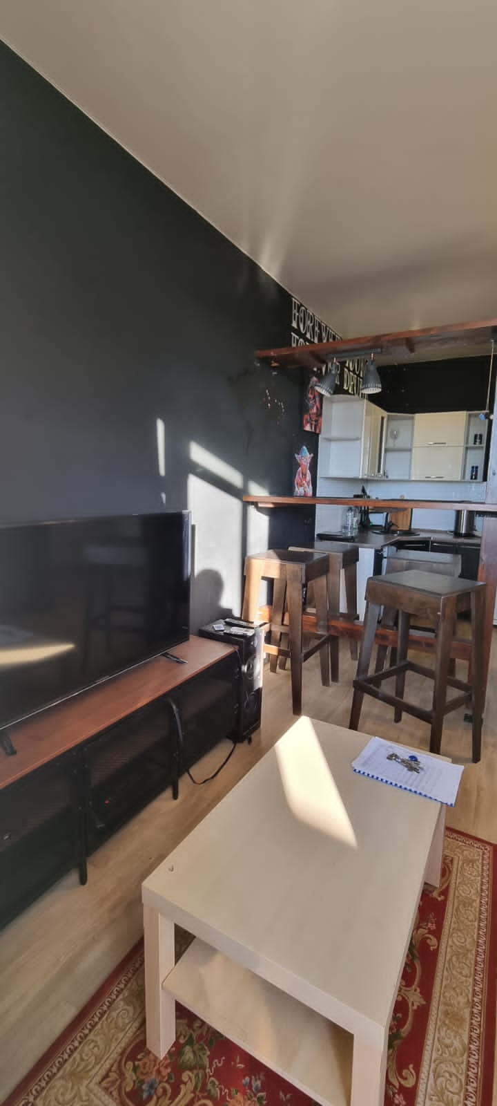 В квартире есть все для комфортного проживания: духовка, плита, барная стойка со стульями, двуспальная кровать, телевизор, стиральная машинка, есть балкон.
