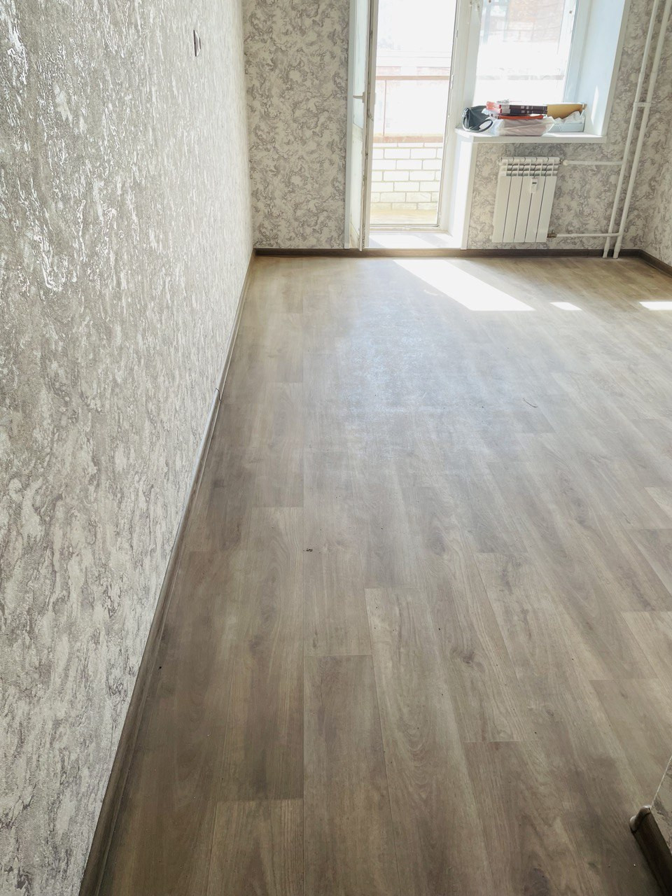 - Одна просторная остекленная лоджия, на полу линолеум.