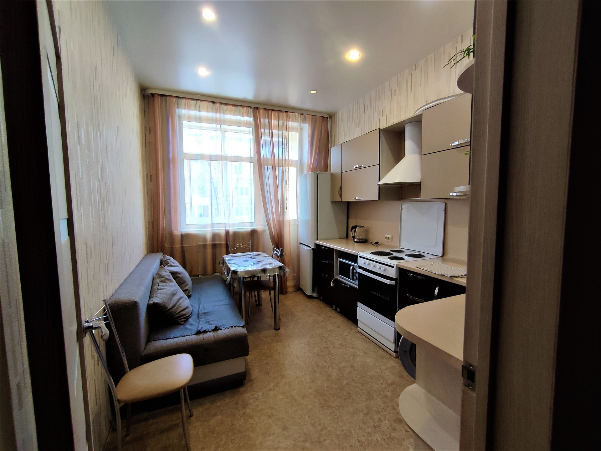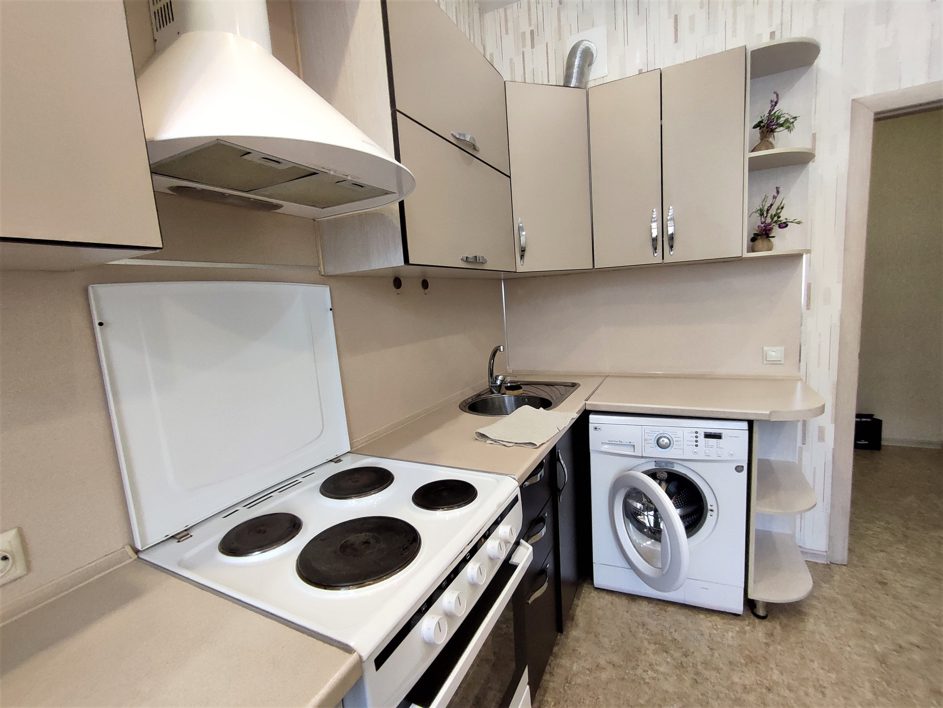 Встроенный кухонный гарнитур, холодильник, микроволновка, электро-печь с духовкой, вытяжка. Установлена стиральная машина. Кухонный стол + стулья.