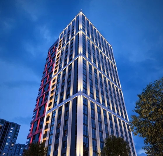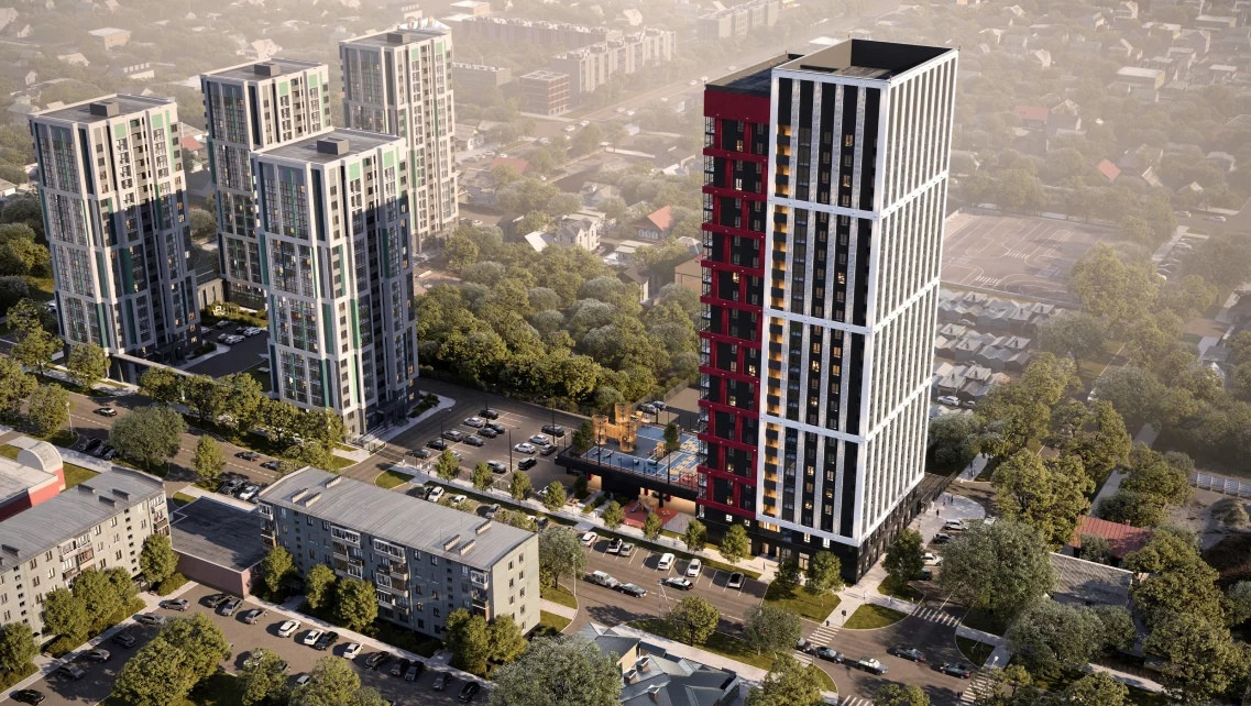 Современный многоквартирный дом с закрытой территорией и ограниченным въездом.