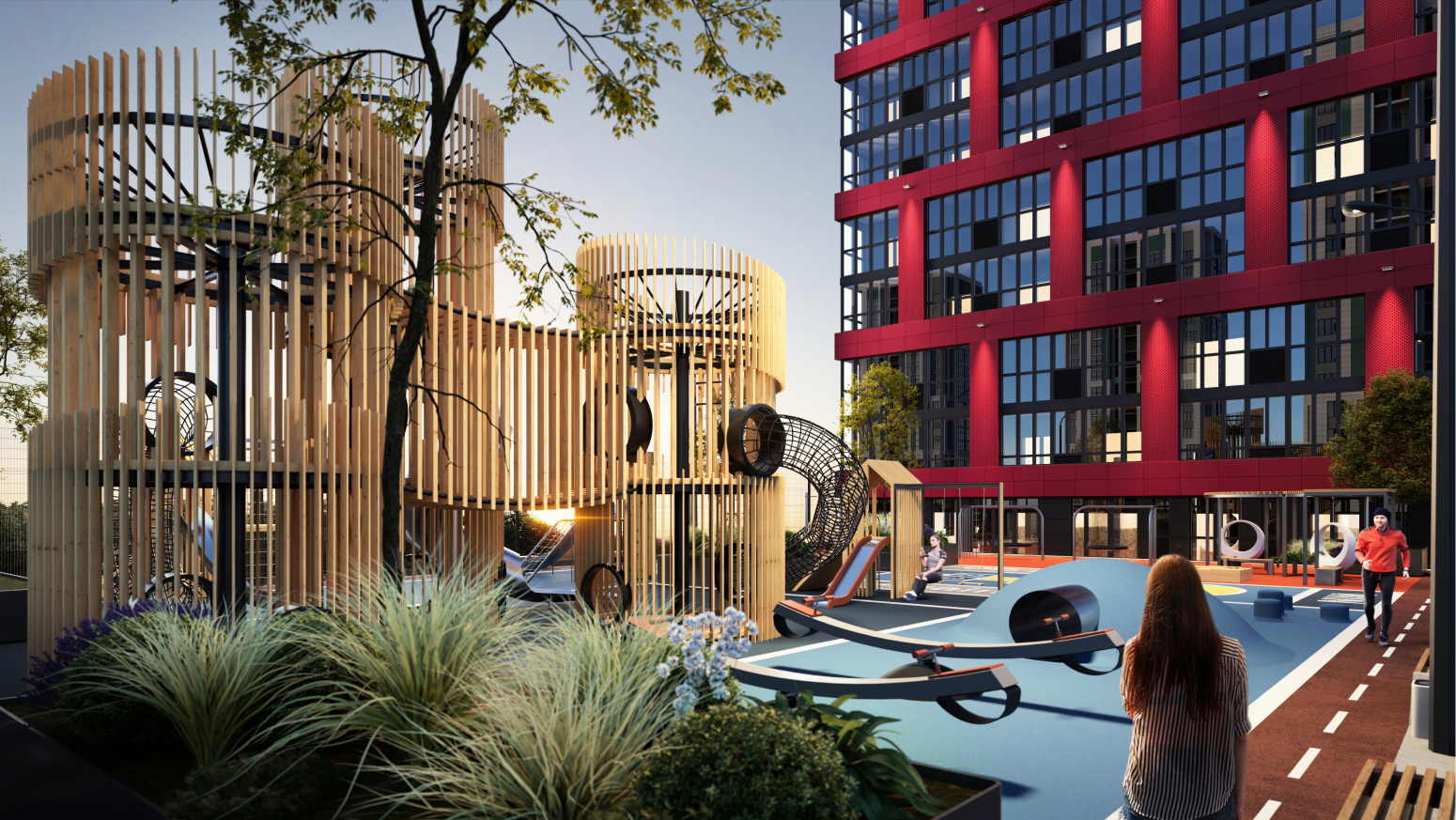 Современный двухуровневый двор с детскими и спортивными площадками.