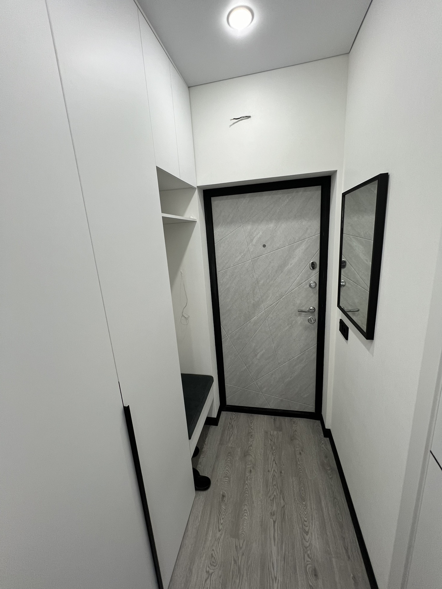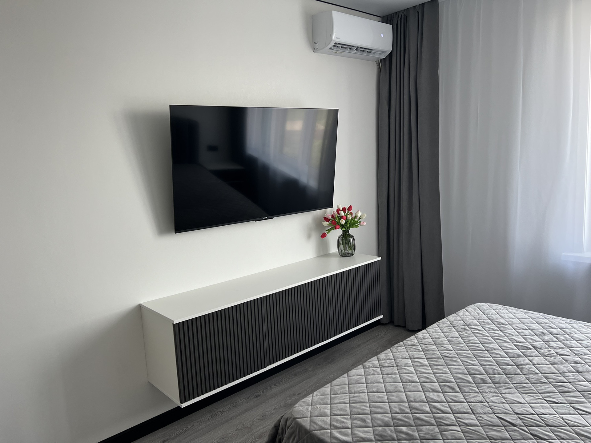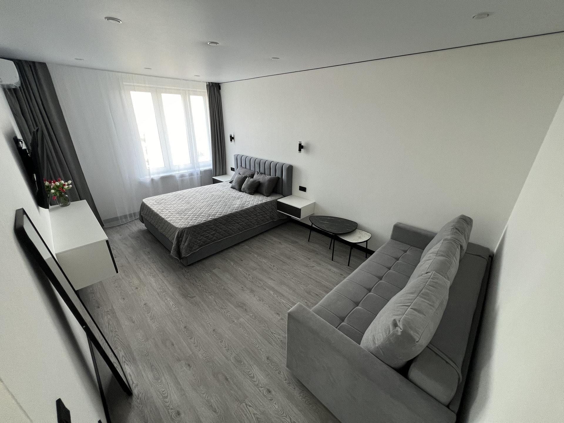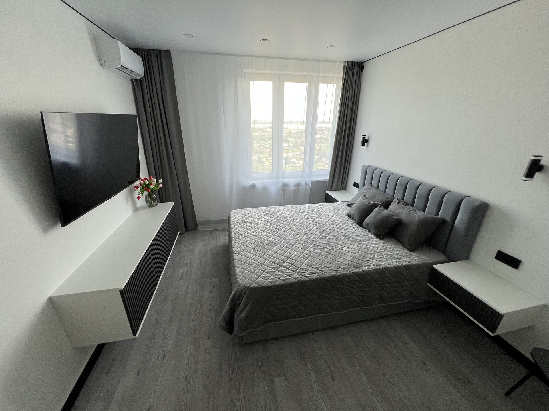В комнате двухспальная кровать с анатомическим матрасом,большой диван, прикроватнные подвесные тумбы и светильники, TV 55 дюймов, тумба под тв.
