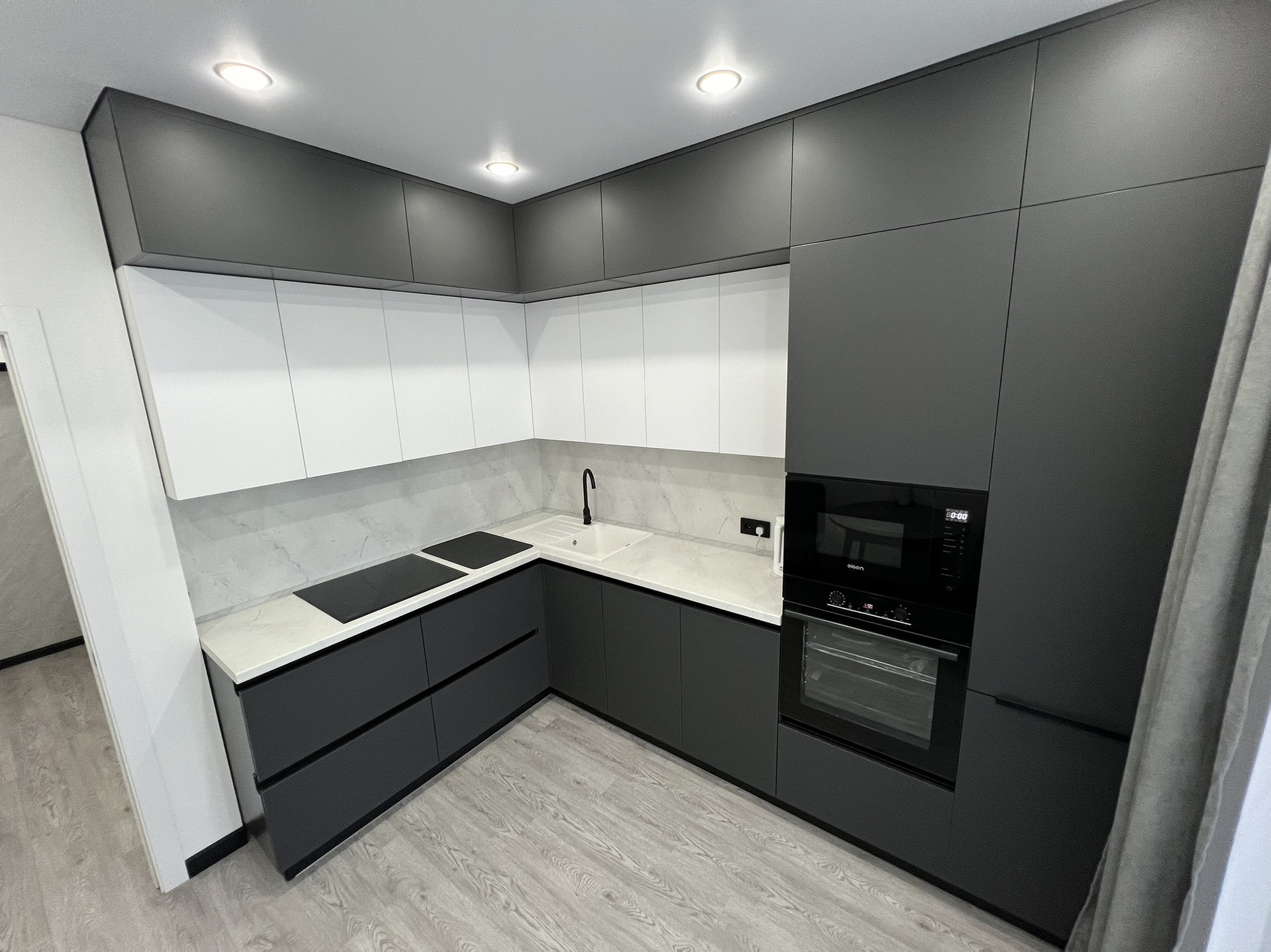 Встроенная кухня с холодильником, духовым шкафом и СВЧ.