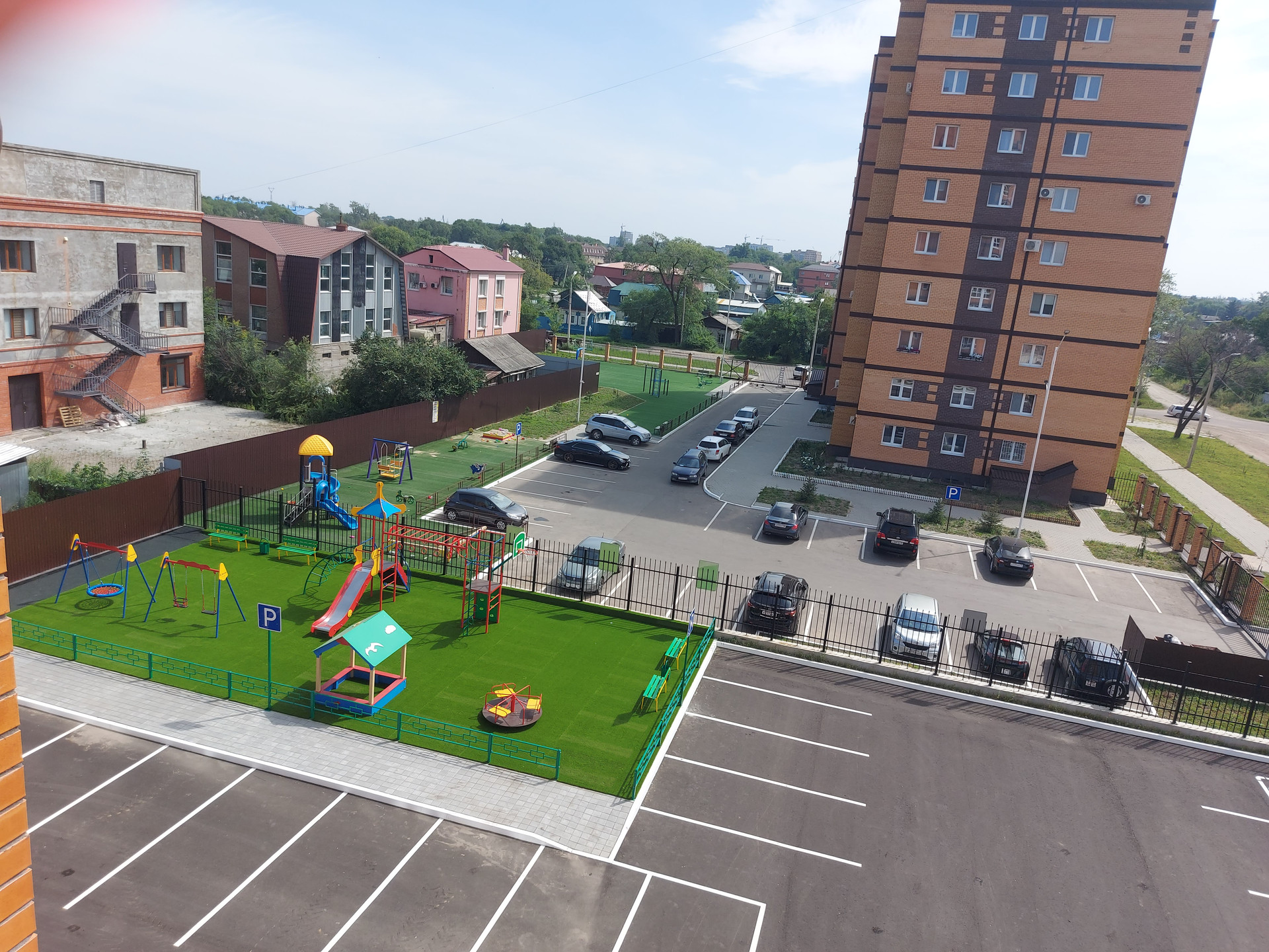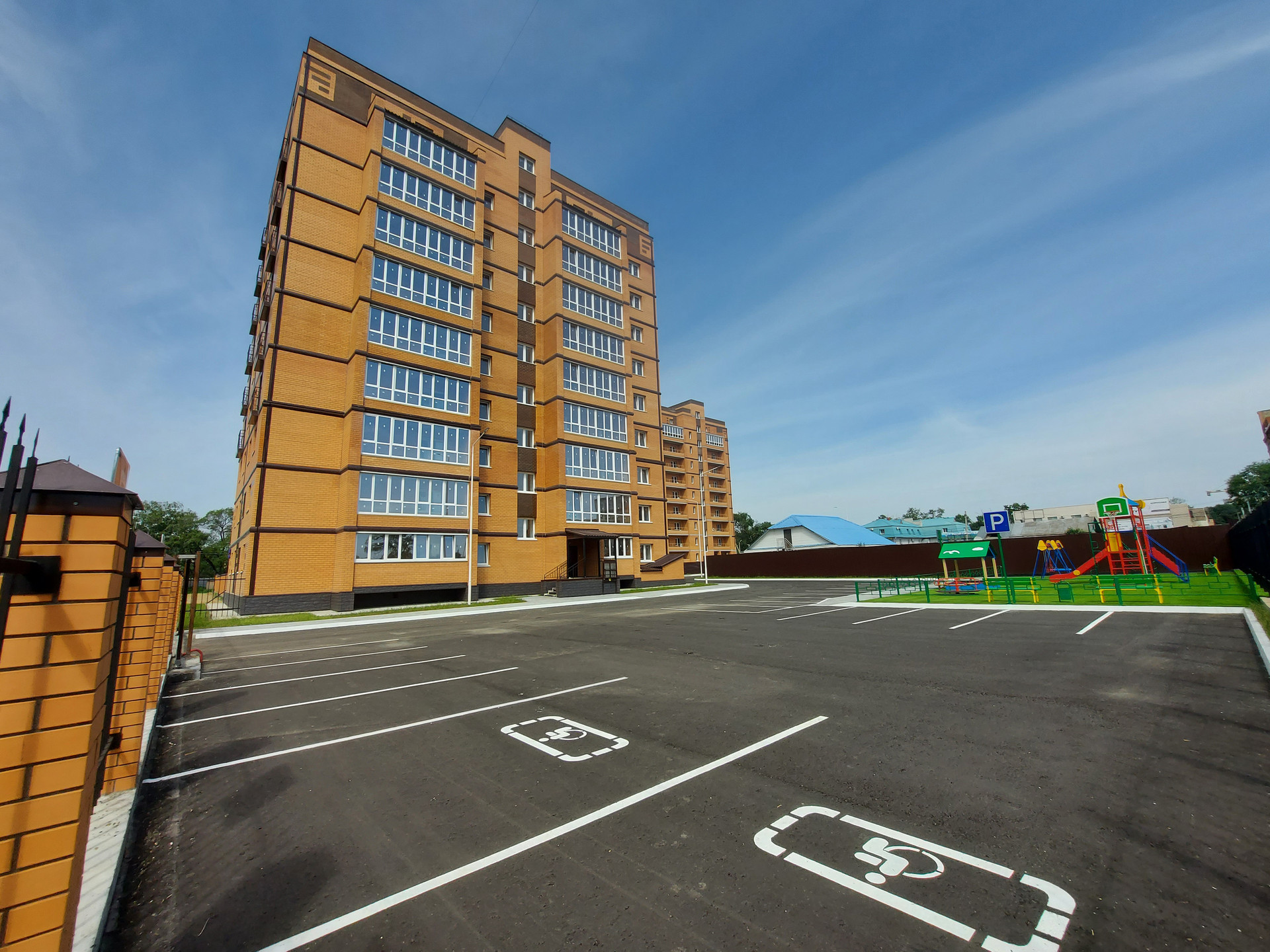 Доступ на огороженную дворовую территорию с помощью автоматических ворот и и системы "умный домофон". Видеонаблюдение. Во дворе - современные детская и спортивная площадки с искусственной травой и цветным резиновым покрытием. Предусмотрены места для парковки автомобилей. Развитая инфраструктура района (школа, детские сады, близость к центру города). Хорошая транспортная развязка дает возможность в считанные минуты добраться в любой район города.