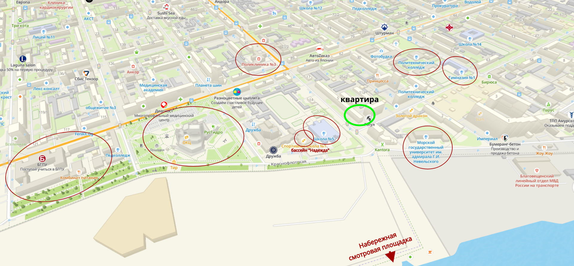 В шаговой доступности одна из лучших школ города No5, начальная школа гимназии No 1, бассейн «Надежда», ОКЦ, набережная.