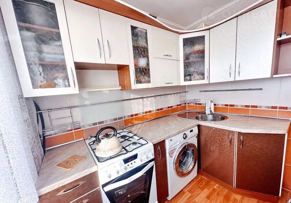 Стены кухни полностью отделаны плиткой. Остается встроенный кухонный гарнитур.