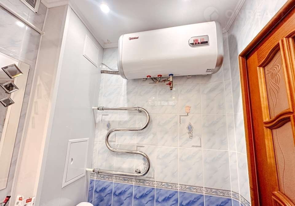 Ванная комната в кафеле. В наличии тумба с раковиной, зеркало и водонагреватель на случай гидравлических испытаний.