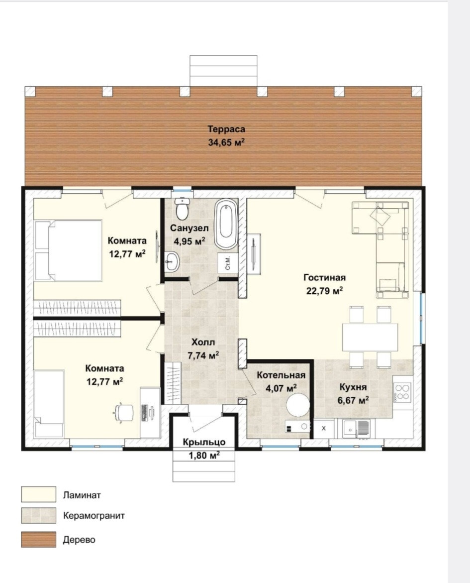 Планировка: В доме 2 спальни, кухня-гостиная с выходом на террасу, совмещённый санузел, котельная оборудована электрокотлом на 12 Квт и водонагревателем на 80 литров