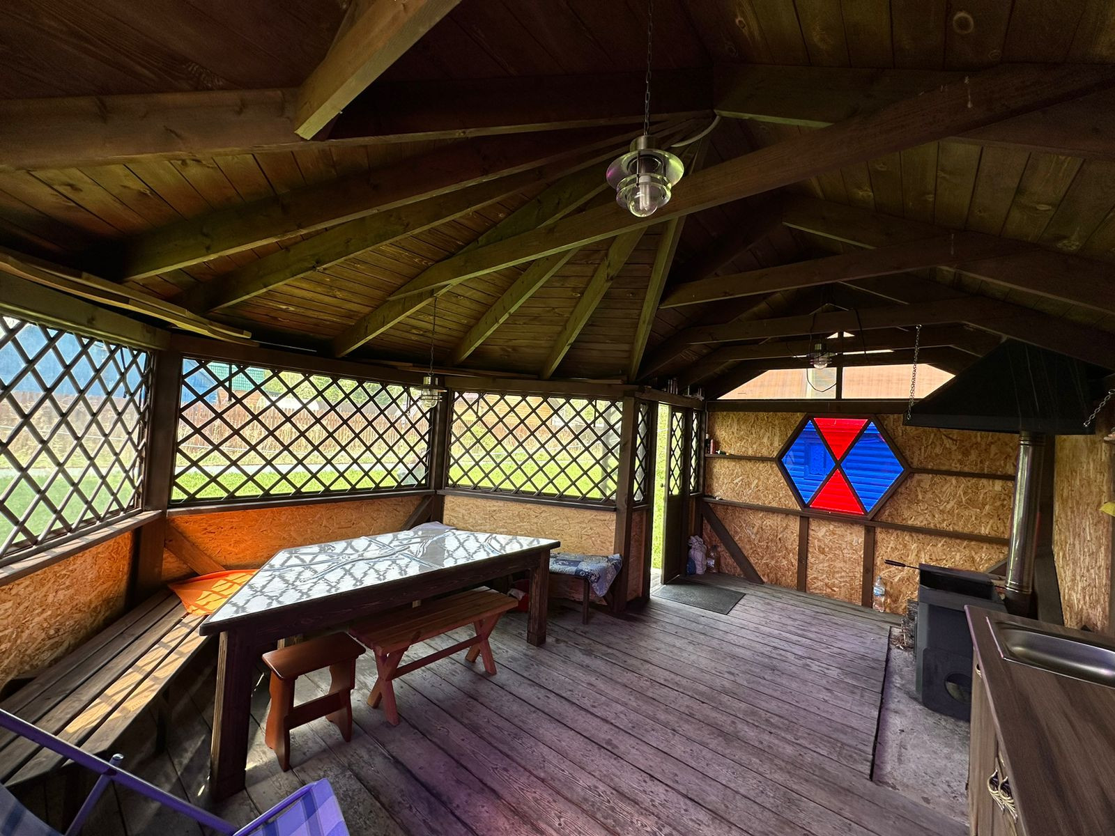 Беседка оборудована профессиональной мангальной зоной 3-в-1 (печь, казан, шашлык) установлен гарнитур из натурального дерева, вода и слив проведена сезонная, стоит нагреватель грячей воды, который нагревает проточную воду. Септик, электричество круглогодично, вода сезонная. На участке есть железный контейнер-вагончик, для хранения инвентаря. Есть возможность прописки. До остановки общественного транспорта минут 15 пешком, до реки Басандайка 15 минут езды на Авто. Торг реальному покупателю .