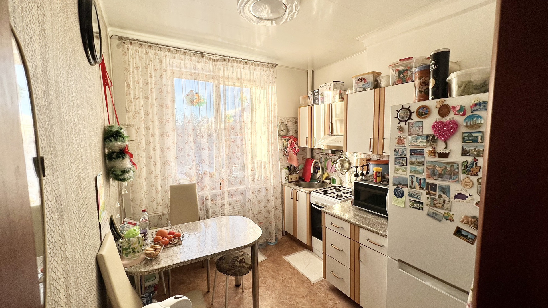 Три просторные светлые комнаты. Пластиковые импортные окна с широкими подоконниками. Везде – рулонные римские шторы и жалюзи. Вид из квартиры на три стороны.