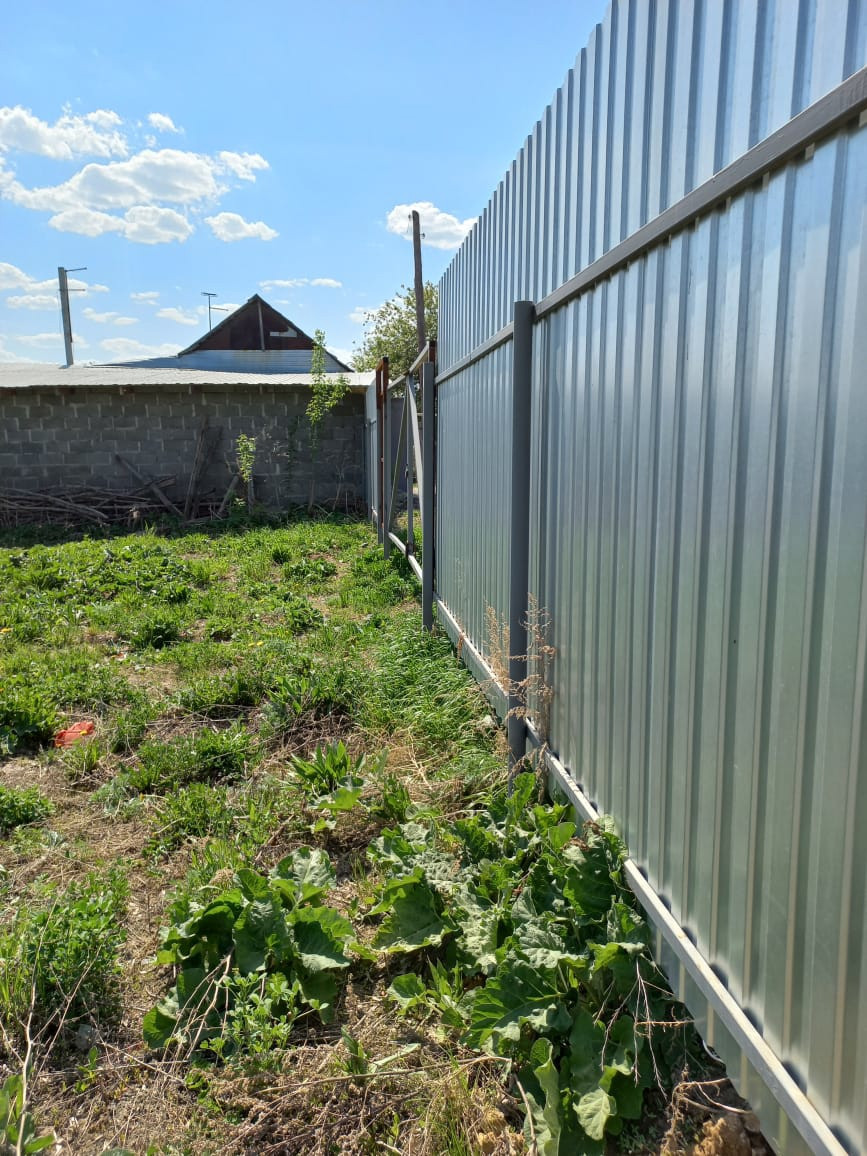 Забор из оцинкованного профиля. На участке установлен строительный вагончик. Проведено электричество, есть колодец , газ.