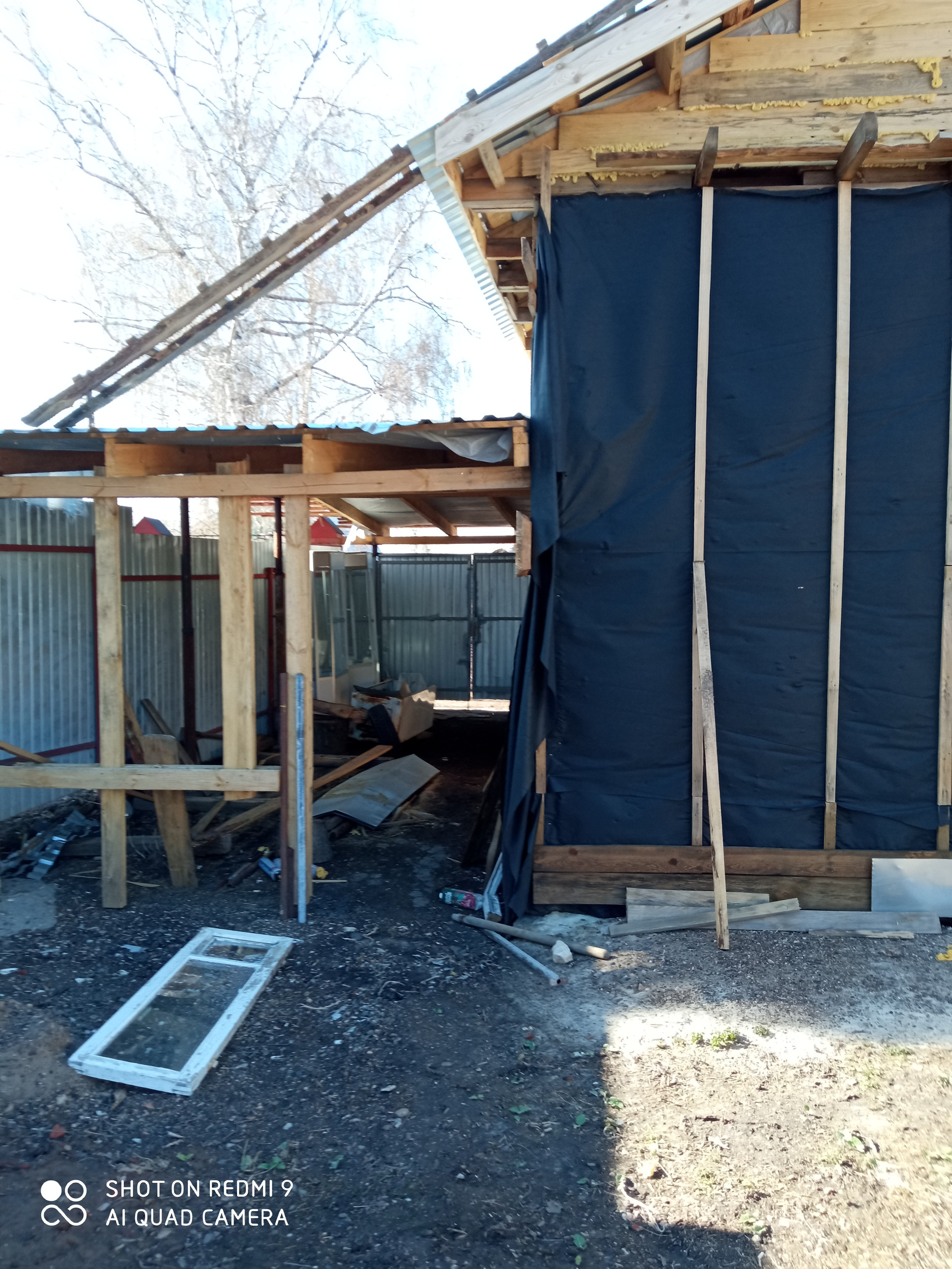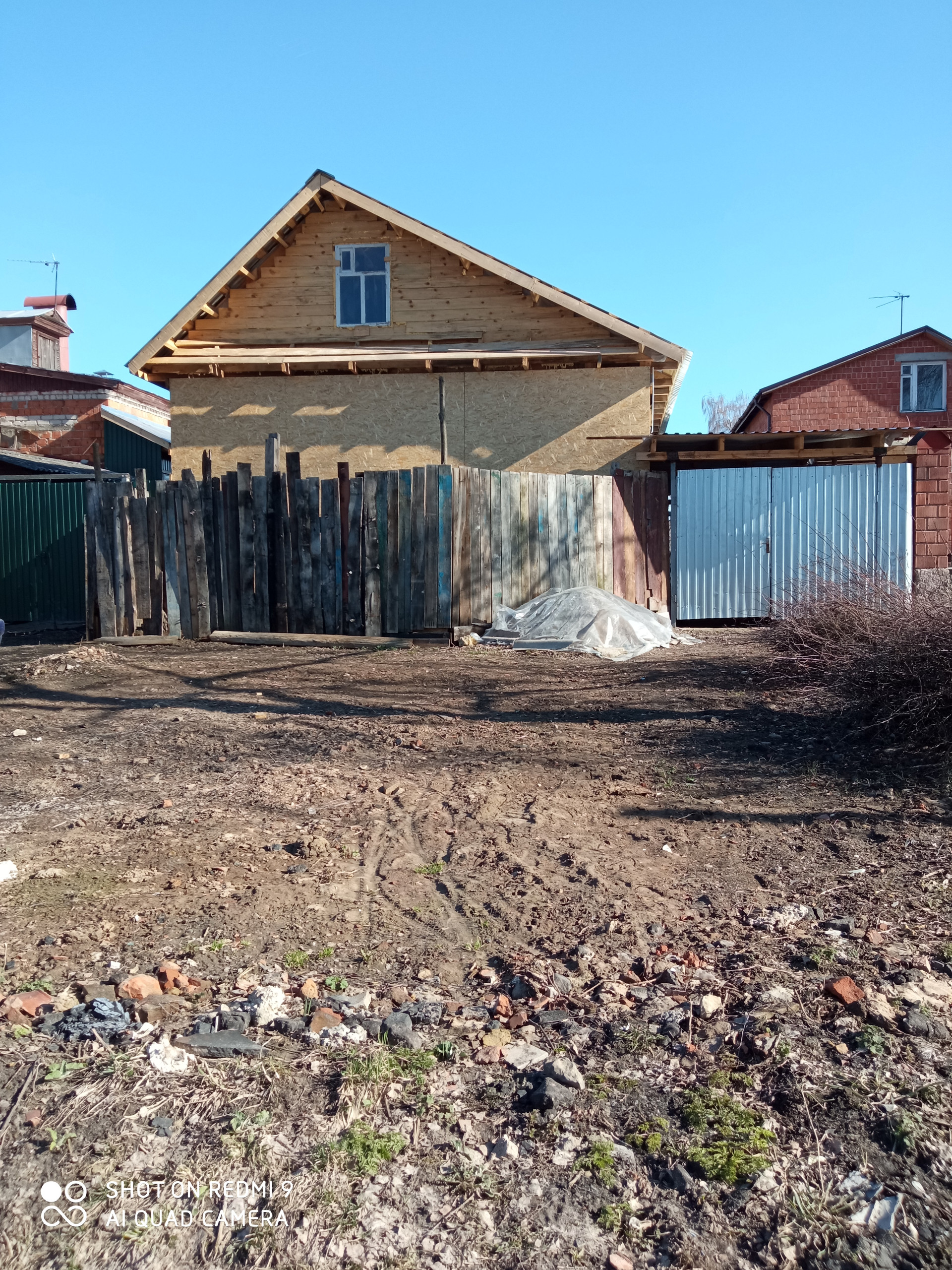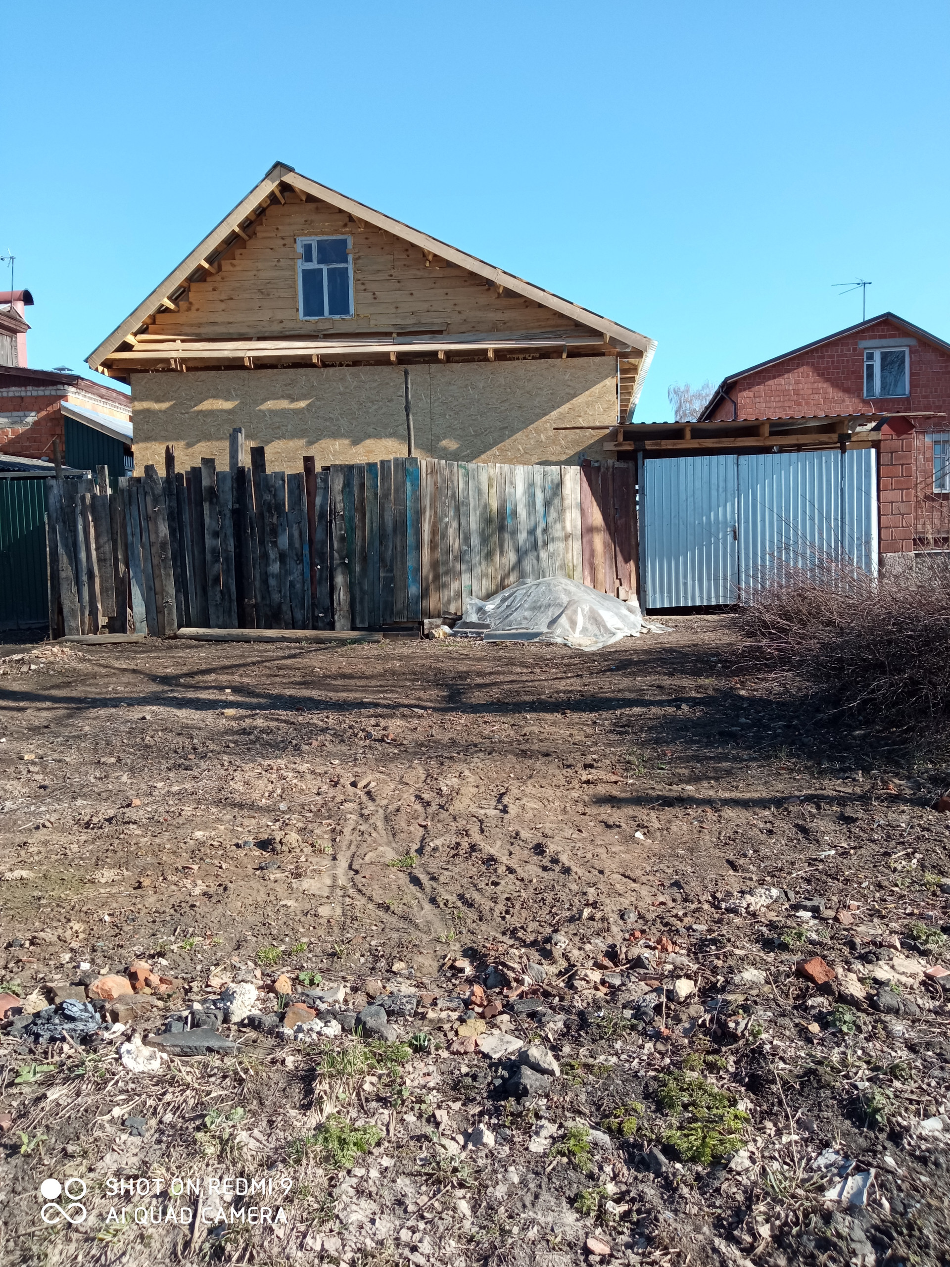 Продам недострой. Каркас под крышей из профлиста, двор крытый, участок ровный.