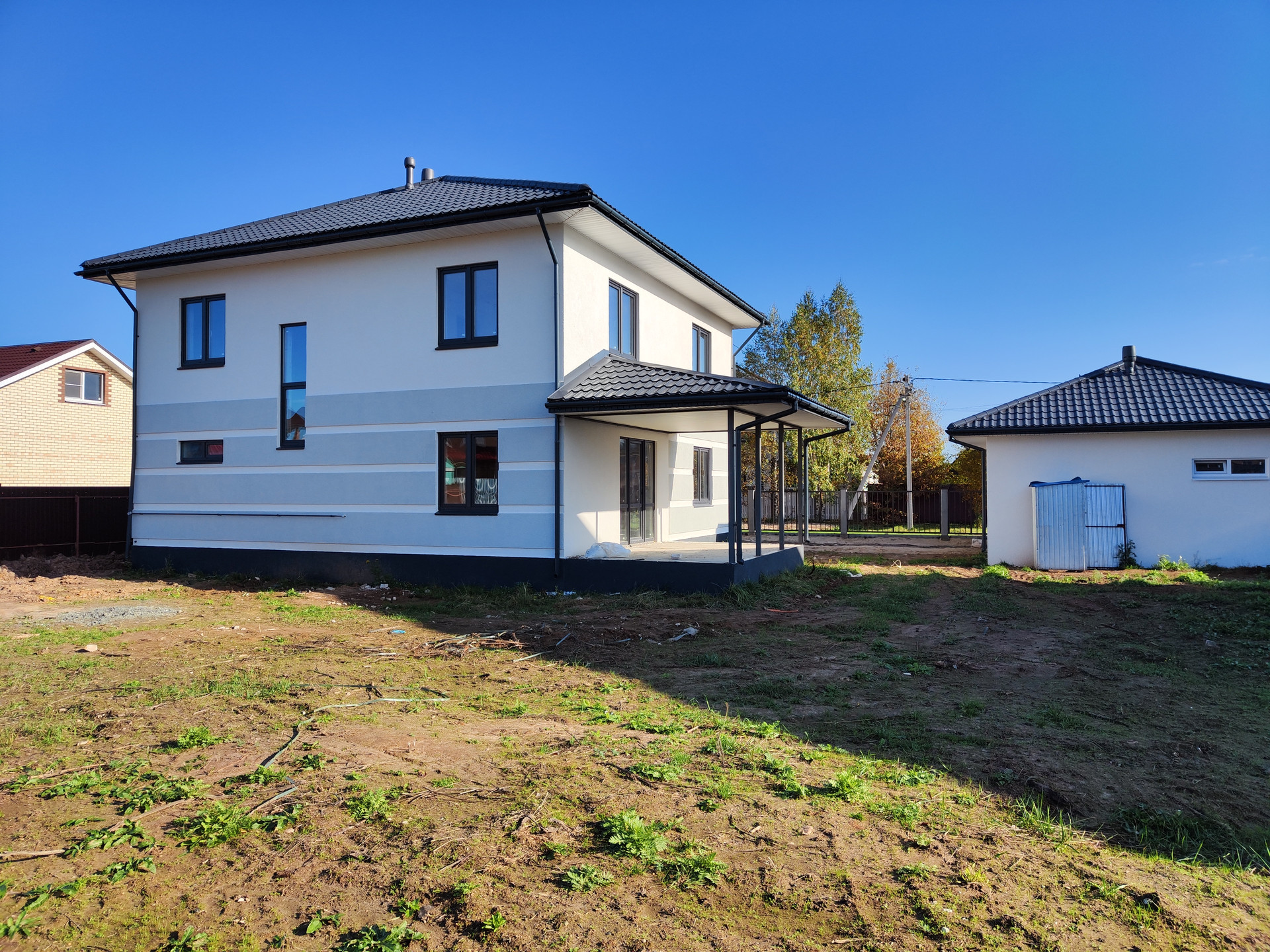 Продается новый дом со всеми удобствами . Четыре комнаты и санузел на 2 этаже. На первом -- просторная кухня-гостиная с выходом на большую террасу (которую можно застеклить), большая ванная , отдельная котельная , большая гардеробная. Наружная отделка акриловой штукатуркой. Веранда открытая 15 кв.м Гараж 42квм на 2 машины, ворота серии " престиж" с автоматикой. Скважина. Сигнализация . Вентиляция со всех комнат. Дверь входная с терморазрывом. Электричество 15квт. Калитка с электрозамком под домофон. Дом продается под финишную отделку вами под ваш дизайн-проект (отделка, лестница и т.п) и ландшафтный дизайн . Система отопления с "теплым полом" работает, электропроводка, штукатурка стен .Дом газифицирован. Установлен каркас лестницы из металла. Можно в доме смонтировать сауну или поставить баню на участке.