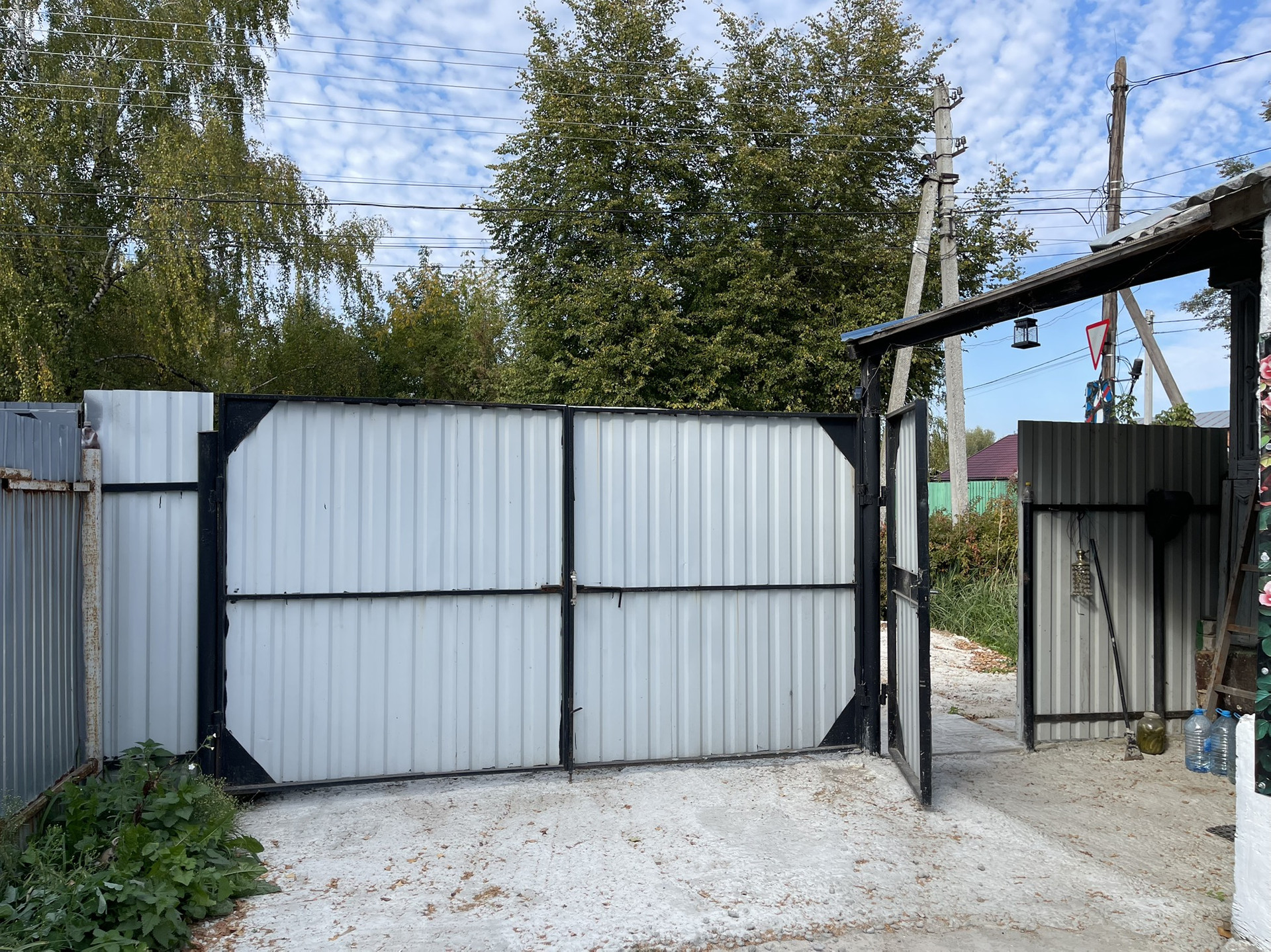 Участок огорожен забором из профнастила, есть открывающиеся металлические ворота для заезда авто.