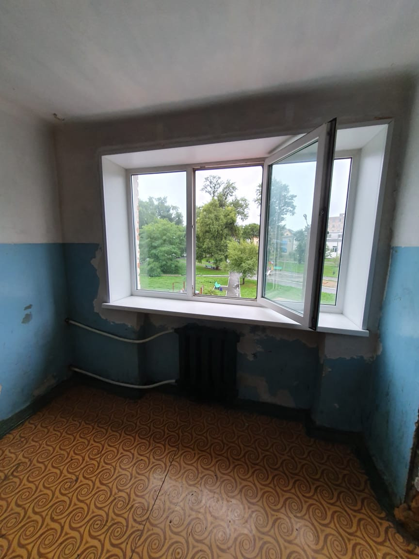 Выровнены стены, пластиковое окна, линолеум, железная дверь.