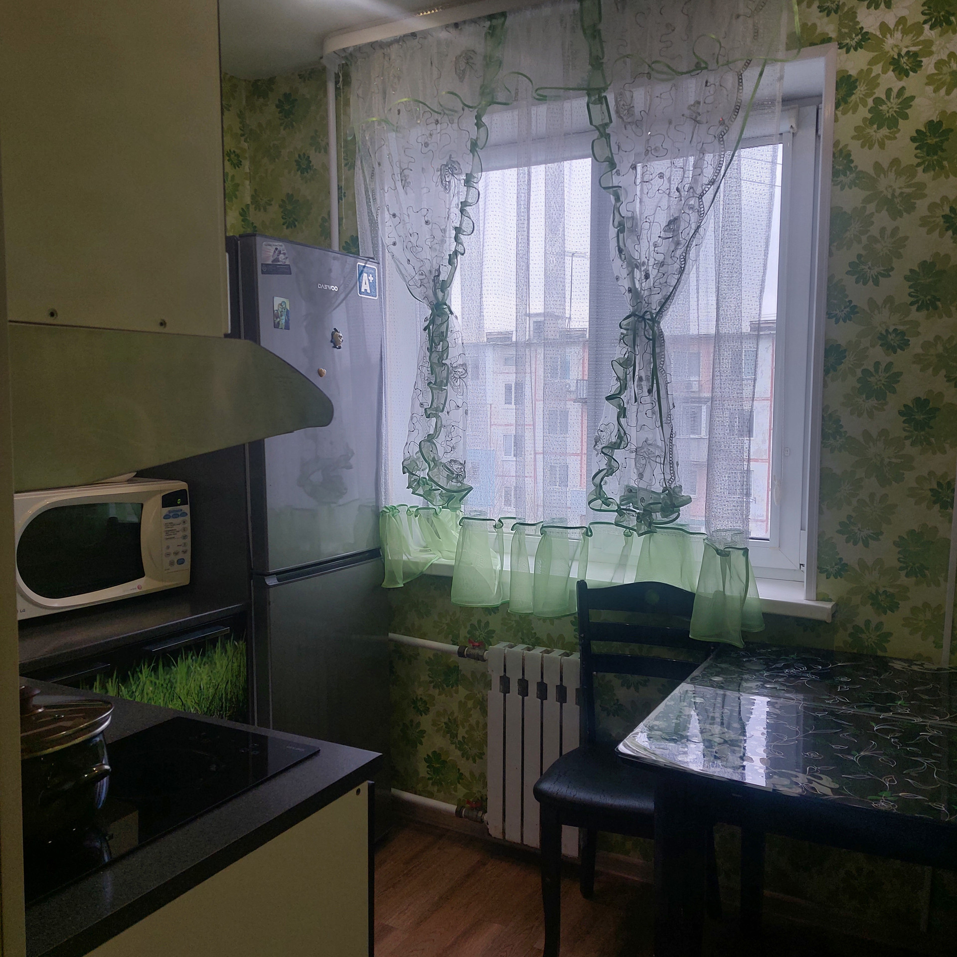 При продаже в квартире остаётся вся мебель и бытовая техника., Двуспальная кровать, Диван, Кухонный гарнитур, Обеденный стол, Стенка, Шкаф, Кондиционер, Стеклокерамическая плита, Холодильник, Стиральная машина