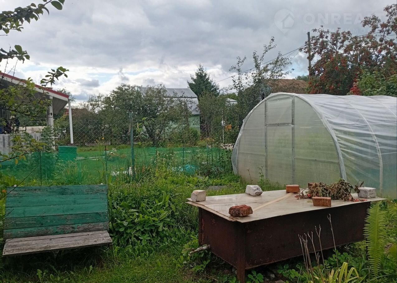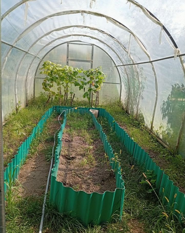 участок ухоженный, с грядками, теплицей и фруктовыми деревьями и кустами