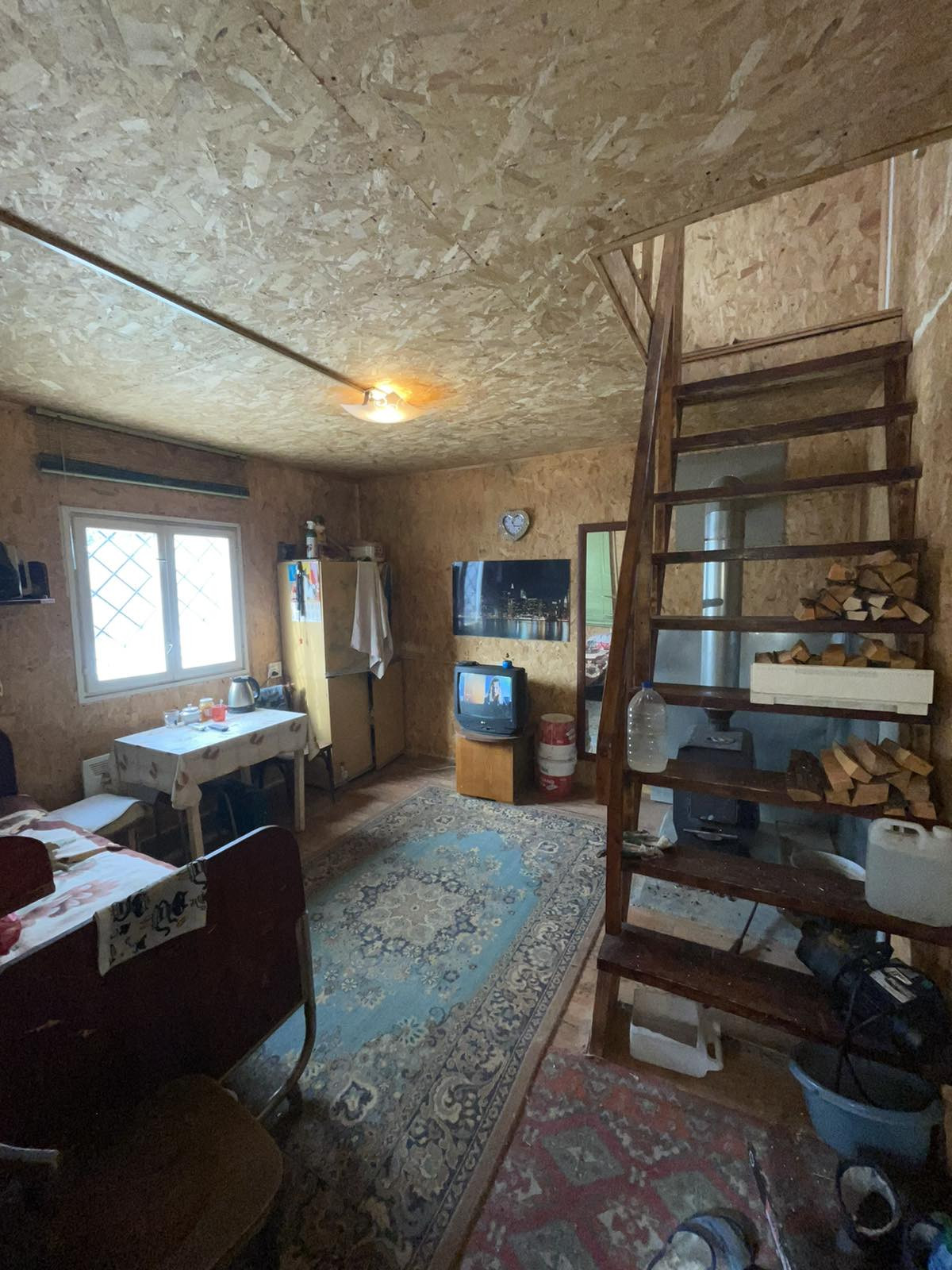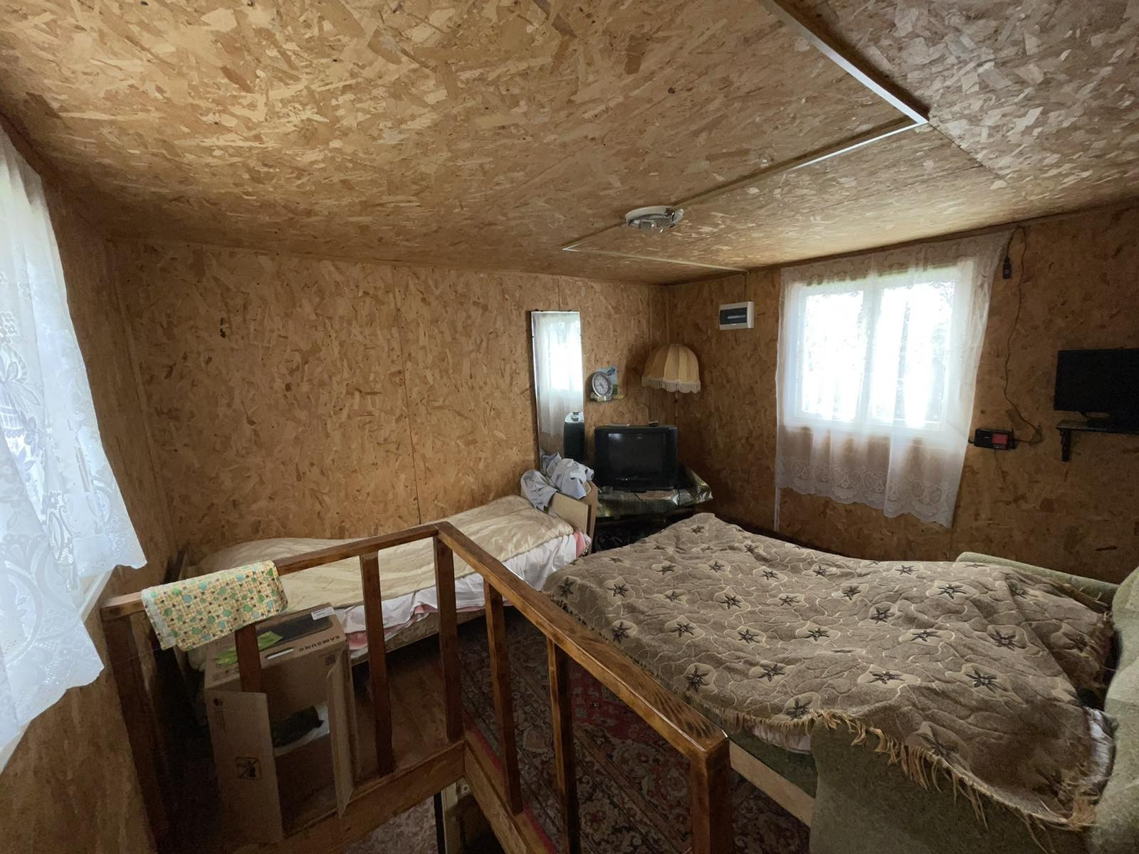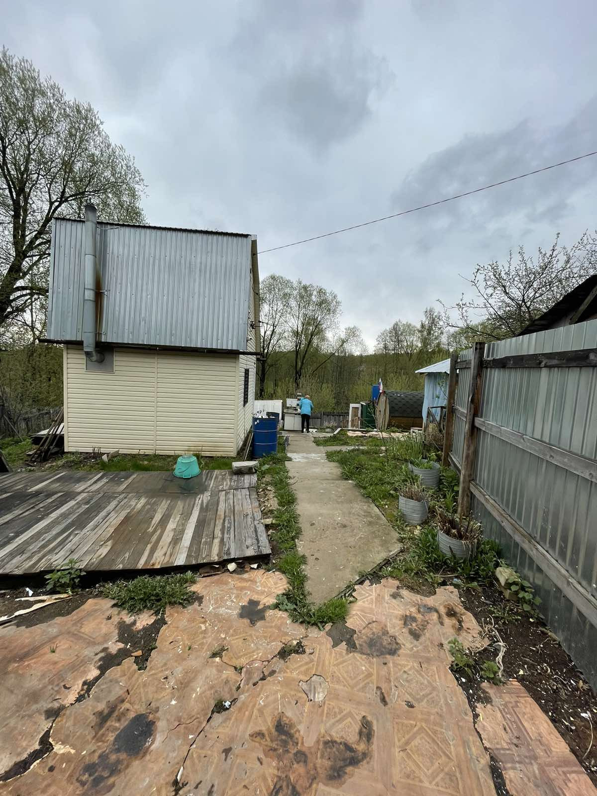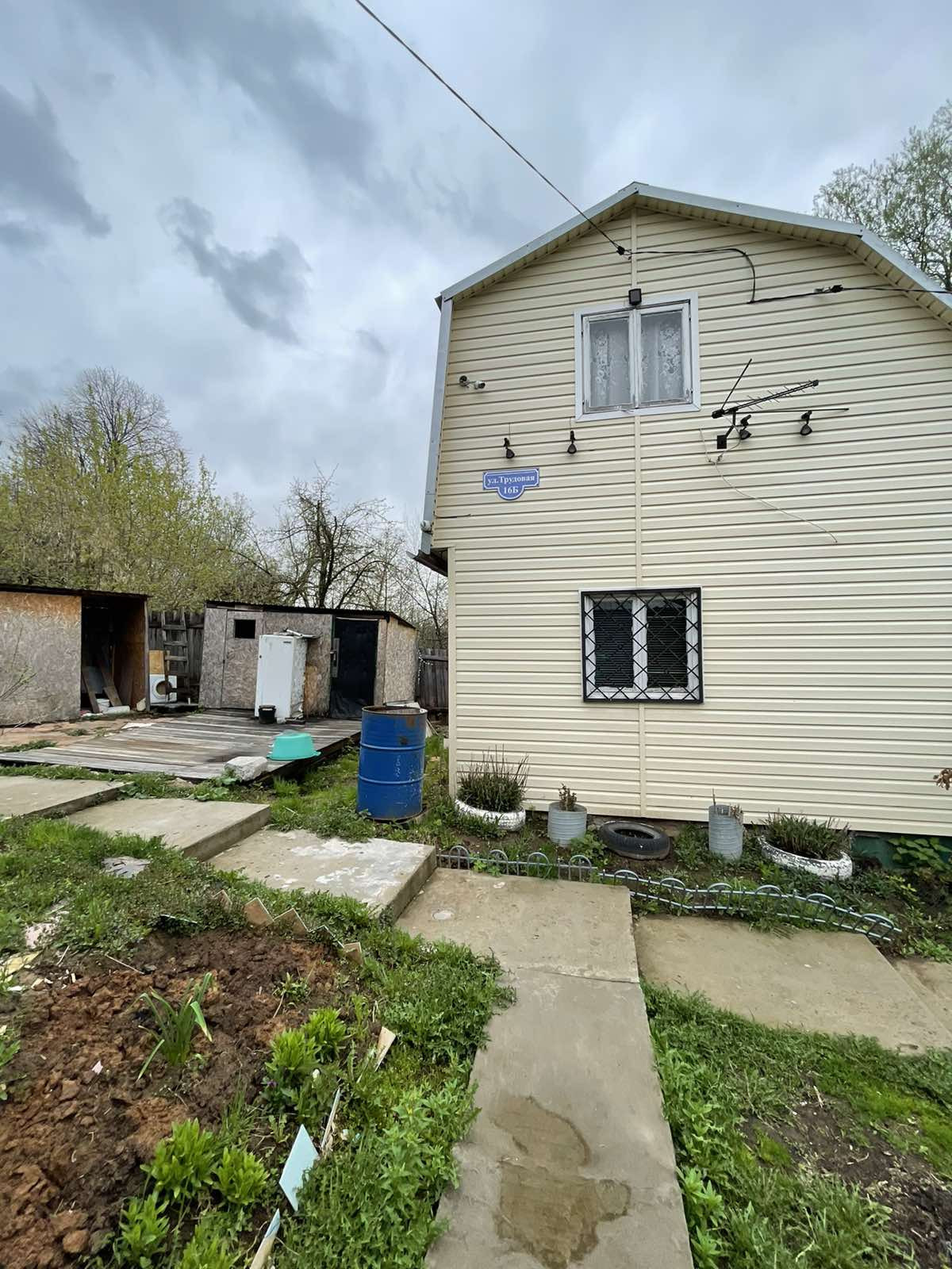 Дом из бруса двух этажный, стены дома утеплены, обшиты сайдингом.Крыша профнастил,утеплена.В доме на первом этаже большая кухня-гостинная,установлена печь.На втором этаже одна комната.