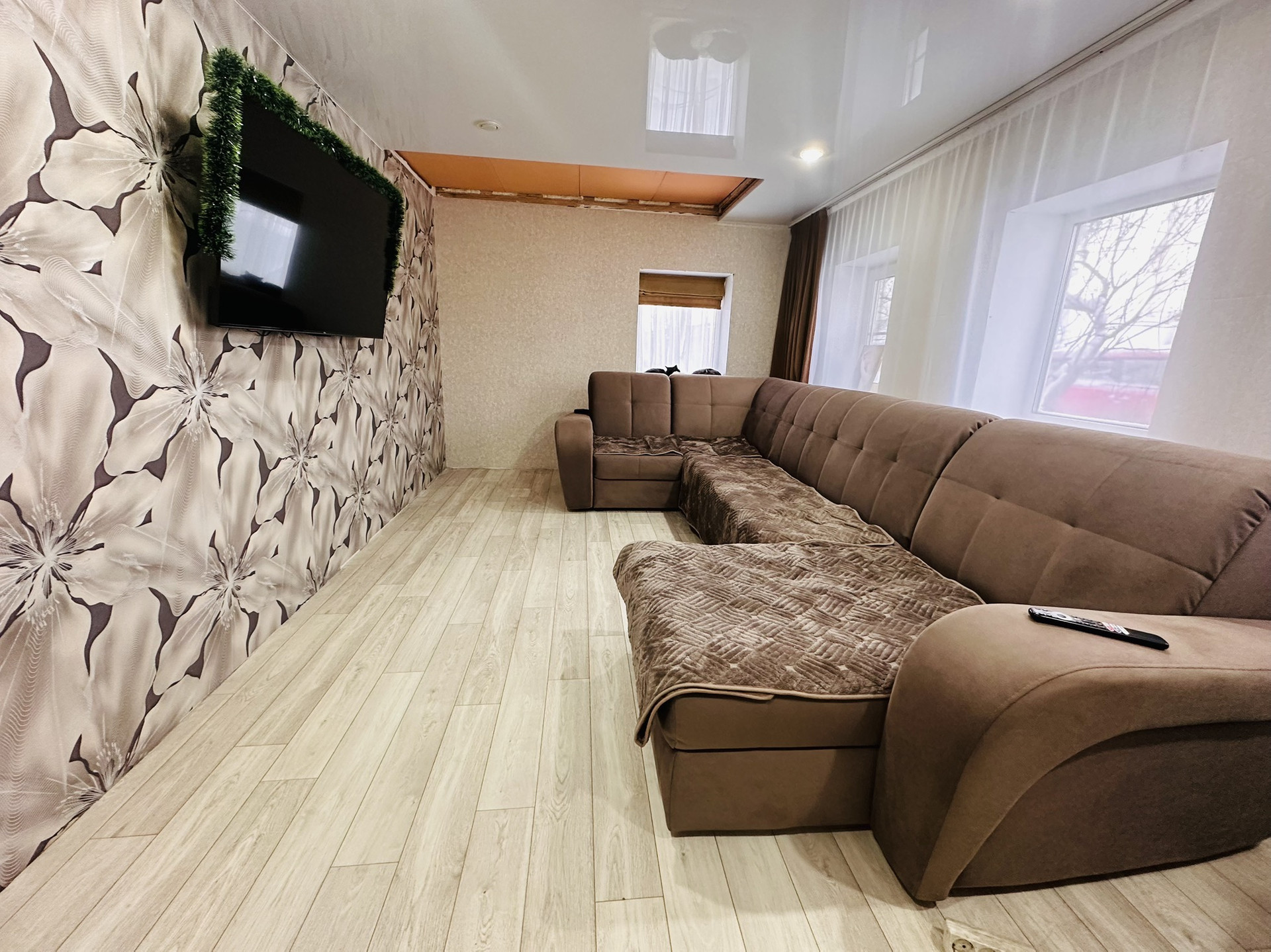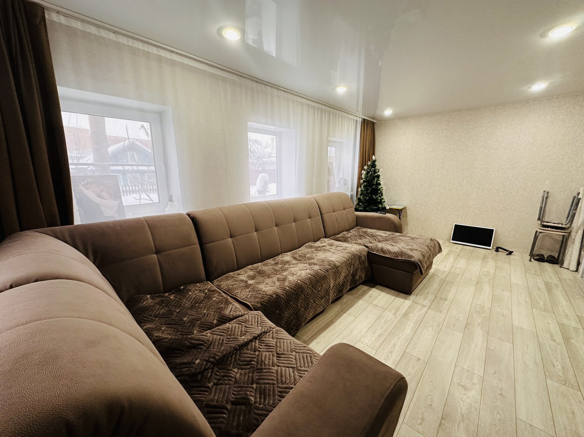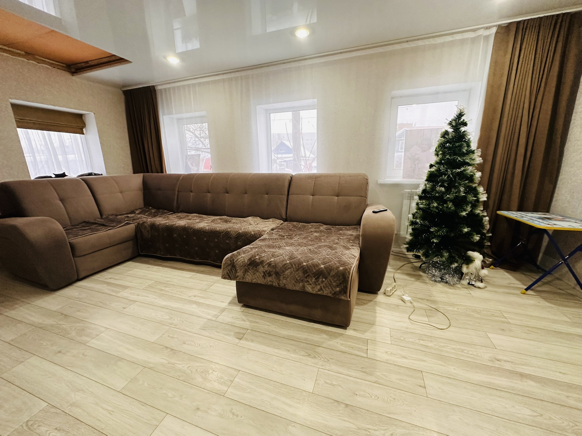 На первом этаже произведен ремонт: сменена проводка, пластиковые окна, натяжные потолки, новые радиаторы, на полу хорошего качества линолеум, в прихожей плитка-теплый пол, сан узел в плитке и тоже теплый пол, отопление от двухконтурного котла фирмы Baxi, центральная вода, установлены счетчики, септик.