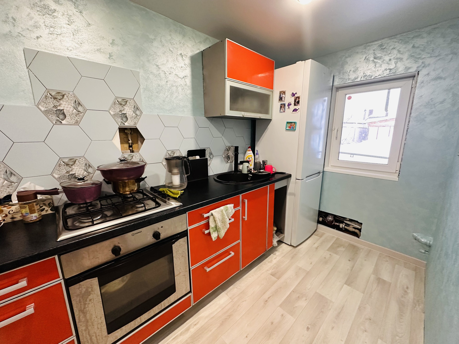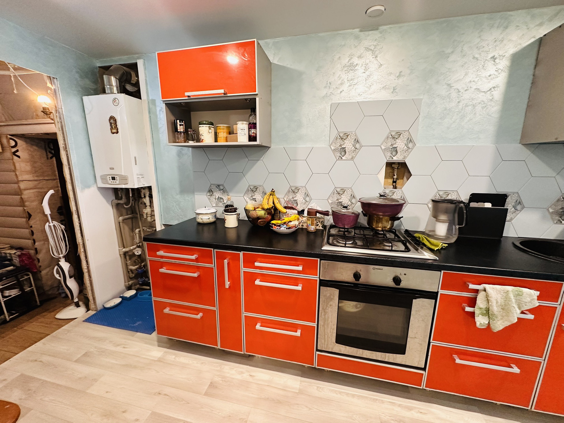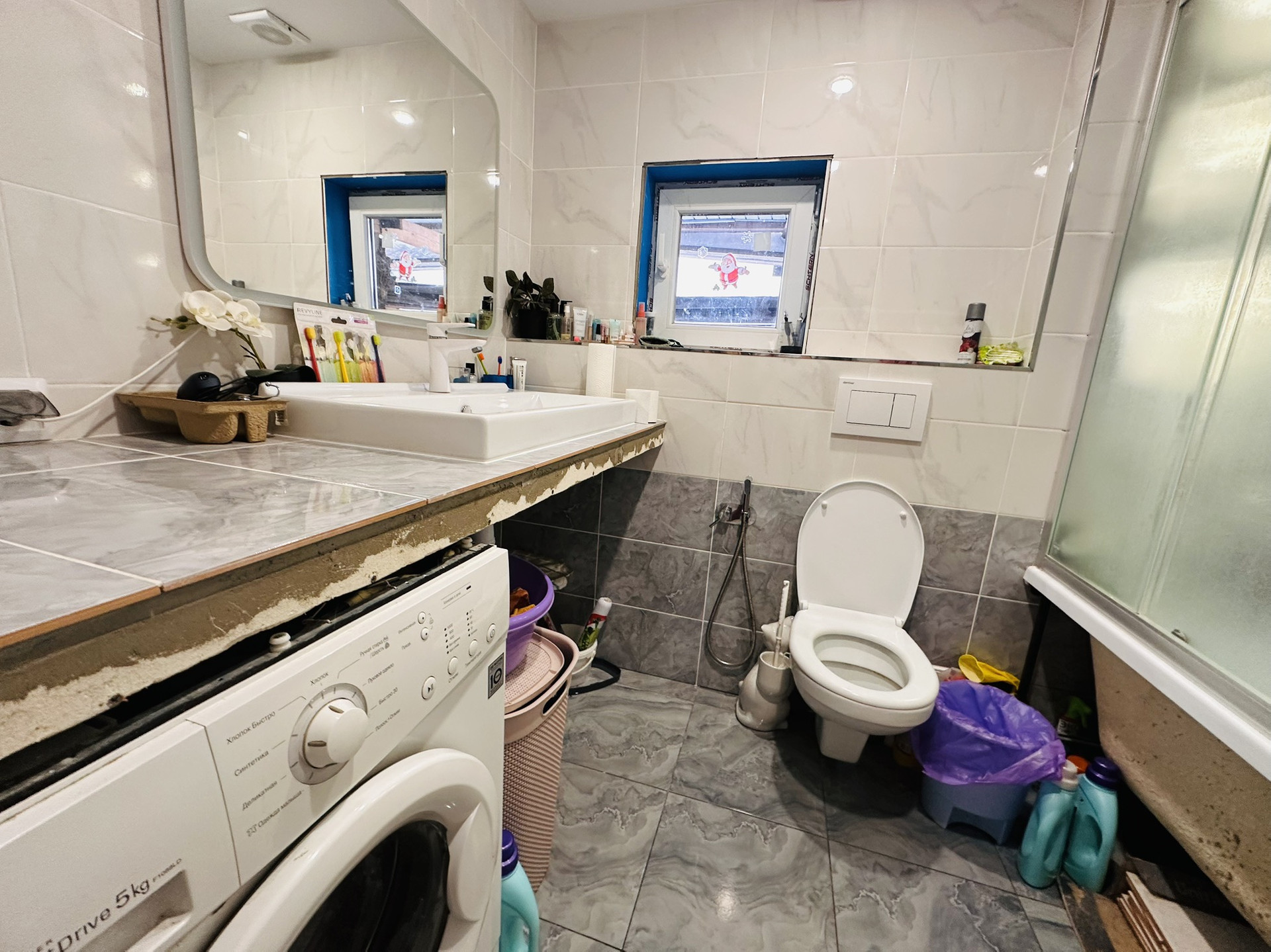 На первом этаже произведен ремонт: сменена проводка, пластиковые окна, натяжные потолки, новые радиаторы, на полу хорошего качества линолеум, в прихожей плитка-теплый пол, сан узел в плитке и тоже теплый пол, отопление от двухконтурного котла фирмы Baxi, центральная вода, установлены счетчики, септик.