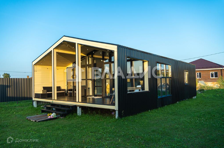 Огромная терраса, большие панорамные окна, высота потолков в коньке 3,2 метра. Дом одноэтажный и прекрасно подходит под круглогодичное проживание