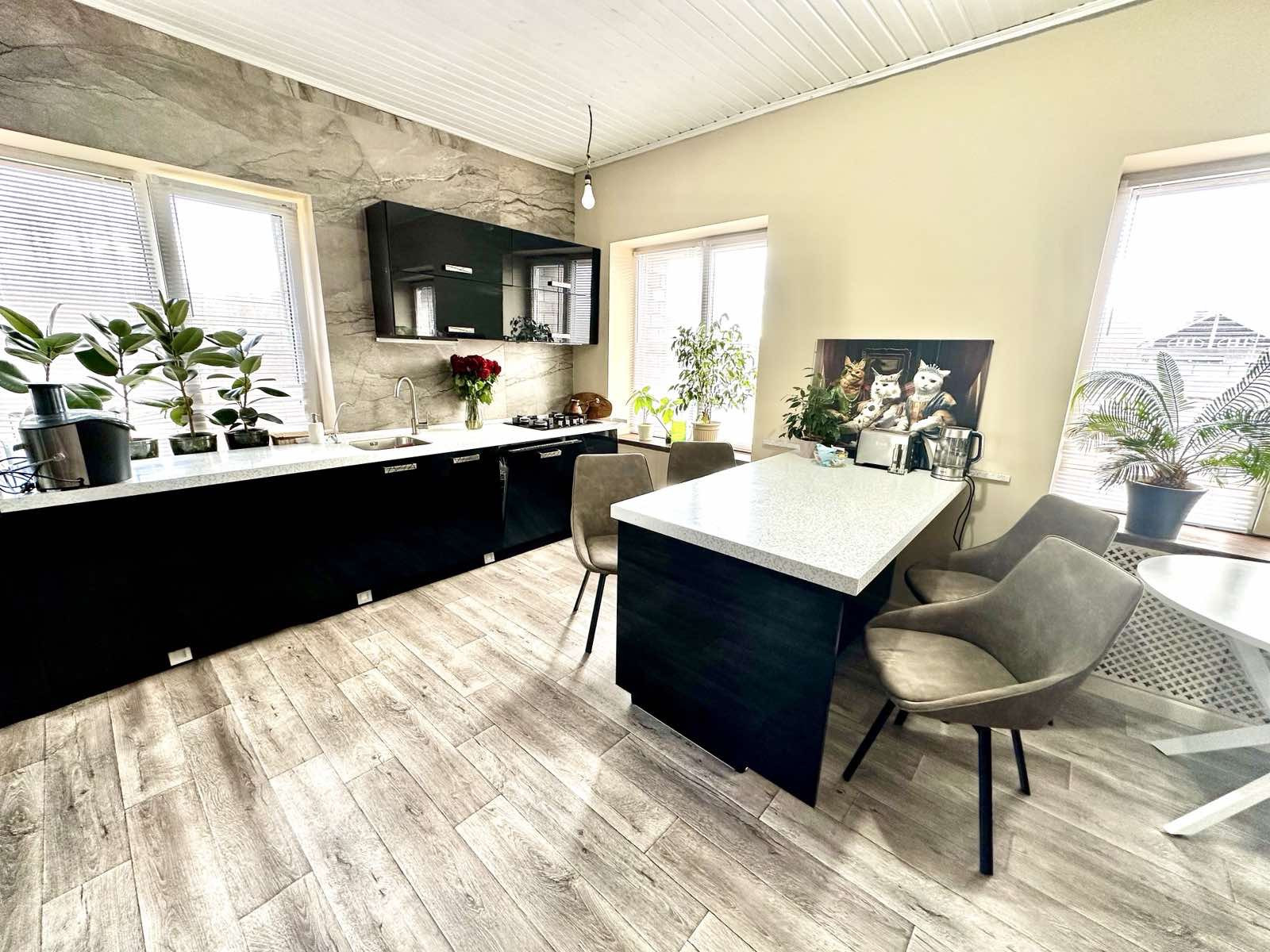 Первый этаж состоит из входной зоны, сан узел, кухня и гостиная ! В гостиной установлен большой встроенный шкаф для хранения вещей. А так же гармоничная полка под телевизор в стиле лофт. Три больших окна позволяет вам насладится всей красотой вашего участка а так же за счет этого в гостиной очень светло! Кухонный гарнитур выполнен из качественных материалов в черном глянце, столешница каменная. Встроенная техника остается в подарок новым владельцам! А именно посудомоечная машина Bosch, вытяжка, варочная газовая плита, встроенный духовой шкаф фирмы FRANKE. Отдельный остров- стол превосходно гармонирует в данном пространстве. В кухонной зоне имеется 3 окна которые так же позволяют вам насладится природой вашего участка. Лестница ведущая на 2 этаж выполнена из дерева-винтовая. На втором этаже располагается 2 спальные комнаты, просторный холл- кабинет, санузел и гардеробная.