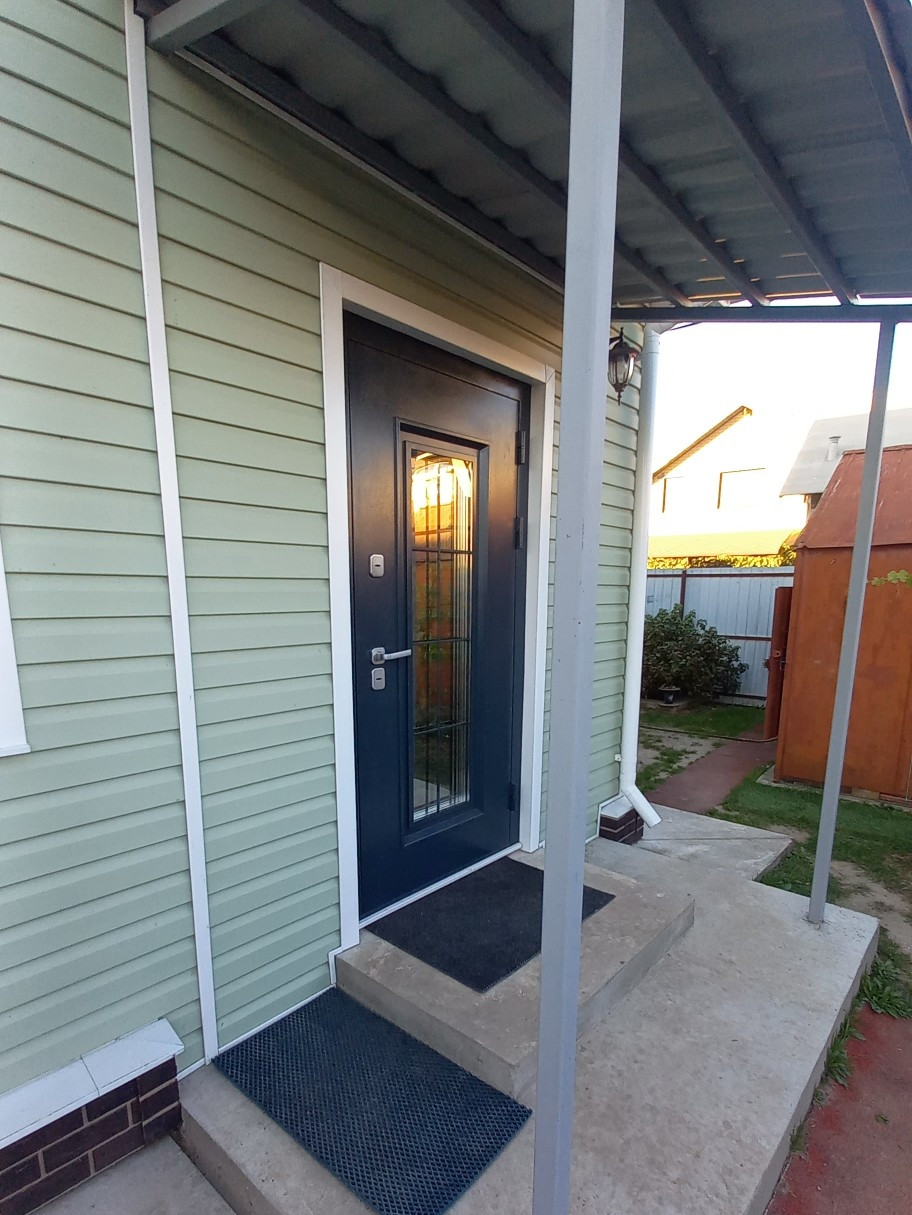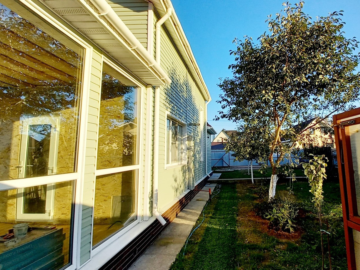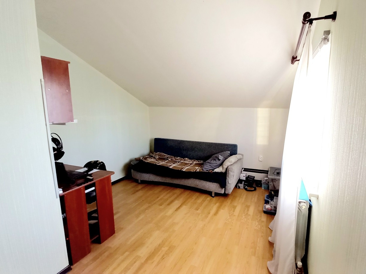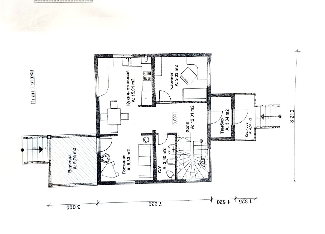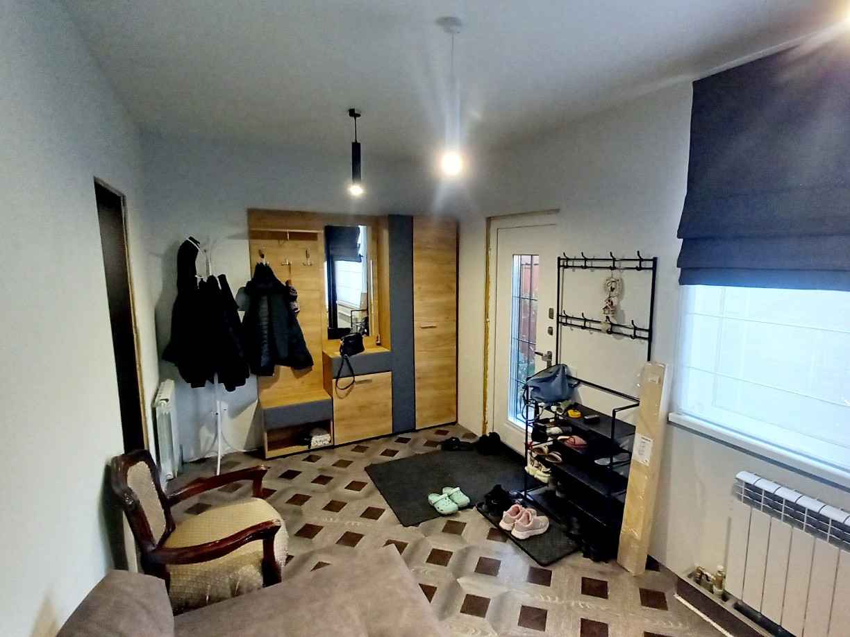 1-ый этаж. Новый тамбур (по площади больше, чем на плане дома). Тамбур теплый, благоустроенный по сути выполняет функцию прихожей. Входная дверь с терморазрывом. Есть санузел (совмещенный). Комната 9,33 кв.м, изолированная. Гостинная 15,91 кв.м. с выходом в просторную кухню (9,33 кв.м.). Кухонный гарнитур остается новым хозяевам. С кухни выход на застекленную панорамным окнами веранду. На момент съемки на веранде ппроизводится ремонт. Проводится отопление, делается теплый пол.