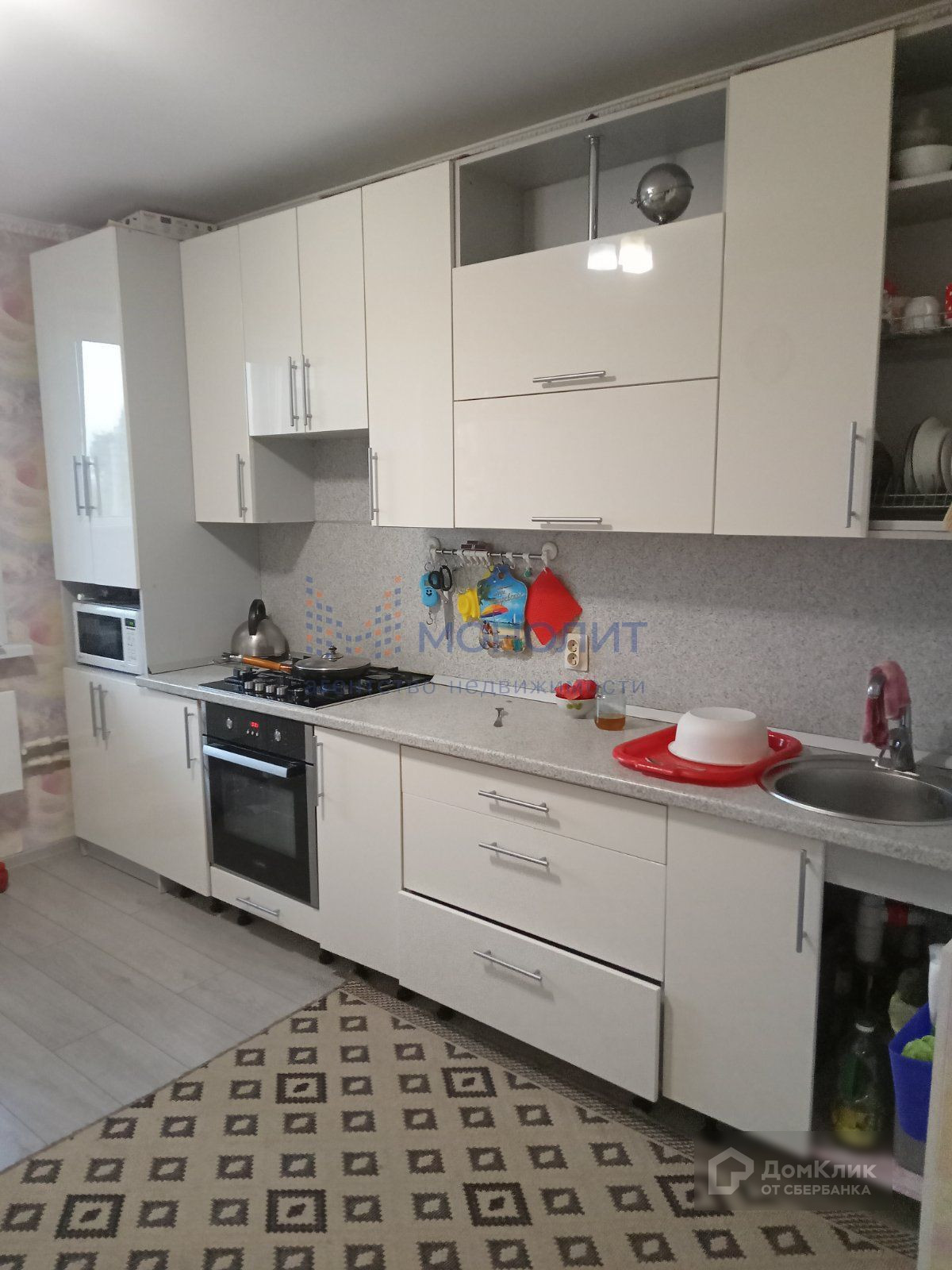 На кухне полы выложены плиткой, установлен кухонный гарнитур, который остается в квартире.