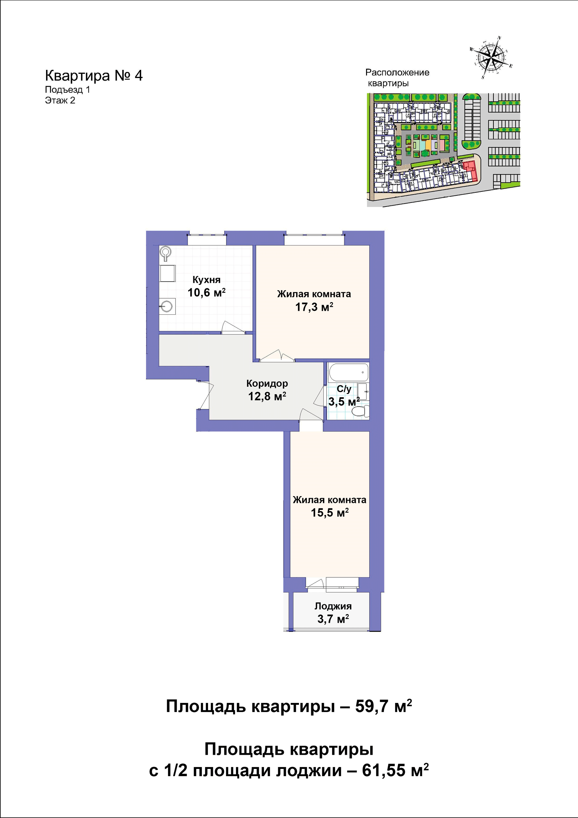 Общая площадь 59.7 м2