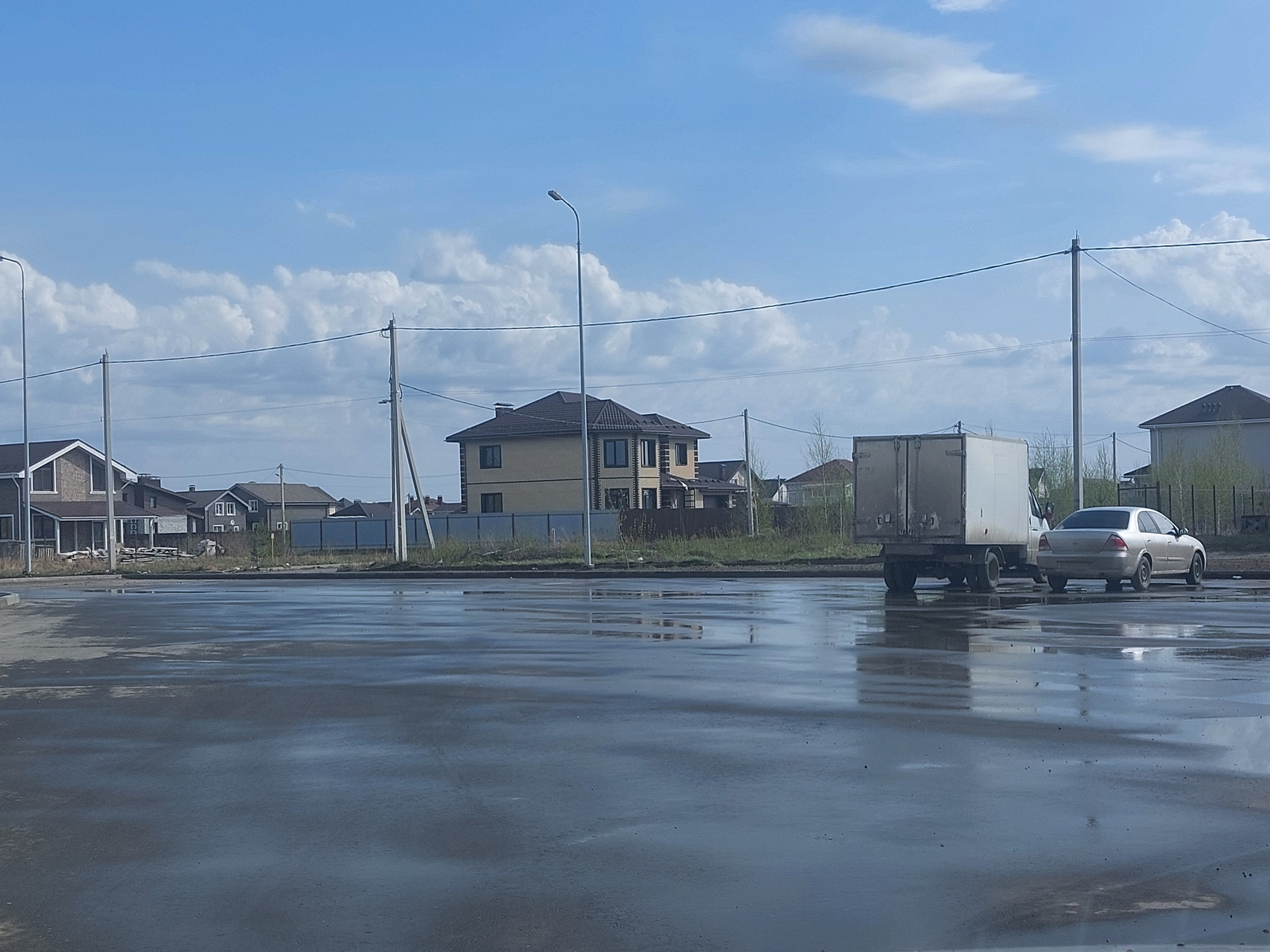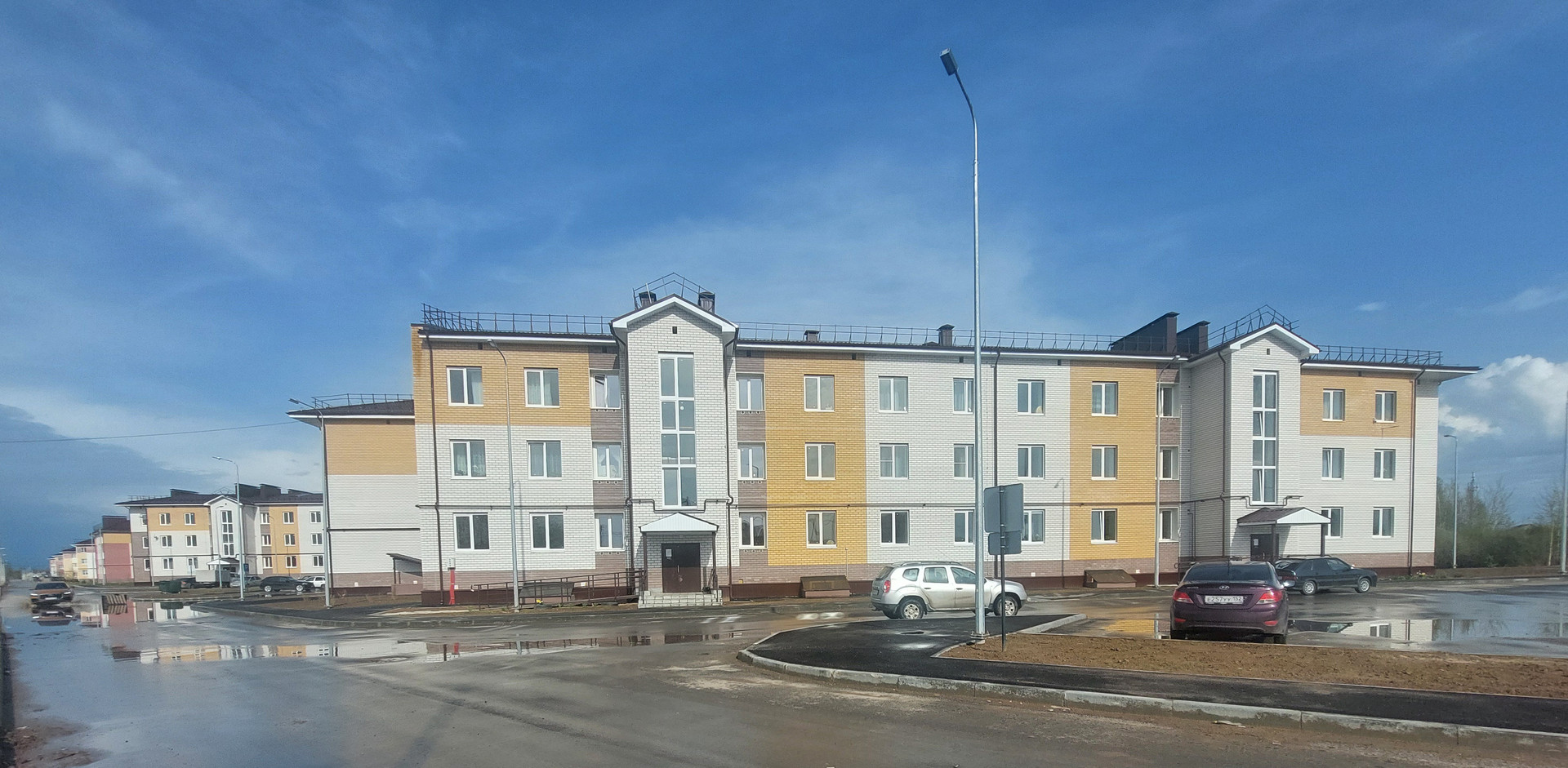 Во дворе большая парковочная зона для автомобилей.