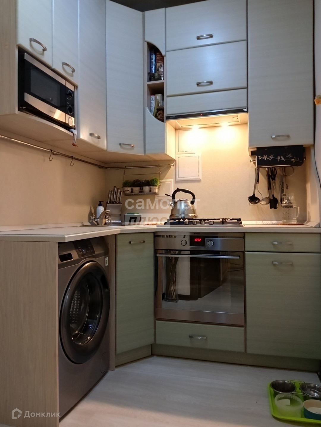 В квартире выполнен хороший ремонт. Пластиковые окна, натяжные потолки, теплый пол в санузле. Встроенная мебель и техника остается бонусом новым хозяевам.