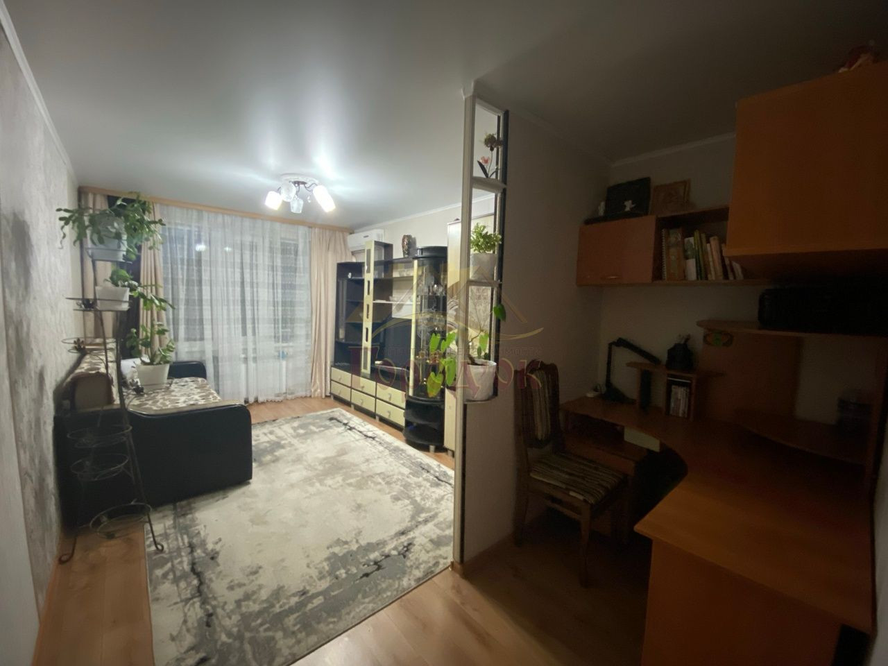 На кухне и в одной жилой комнате напольное покрытие ламинат, во второй комнате и в коридоре - линолеум.