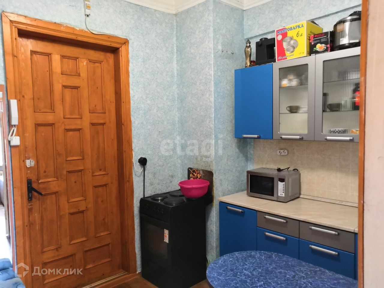 В коридоре оборудована очень вместительная кухня, что позволит удобно хранить бытовую технику и кухонную утварь при этом оставив рабочую зону для приготовления пищи.