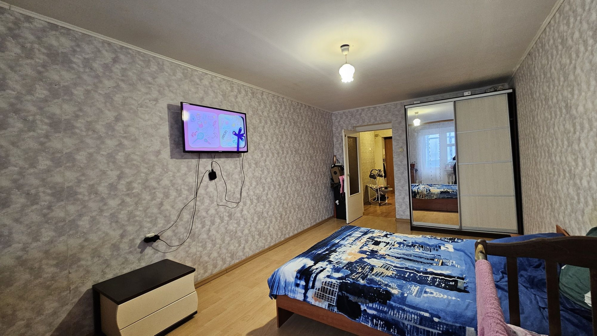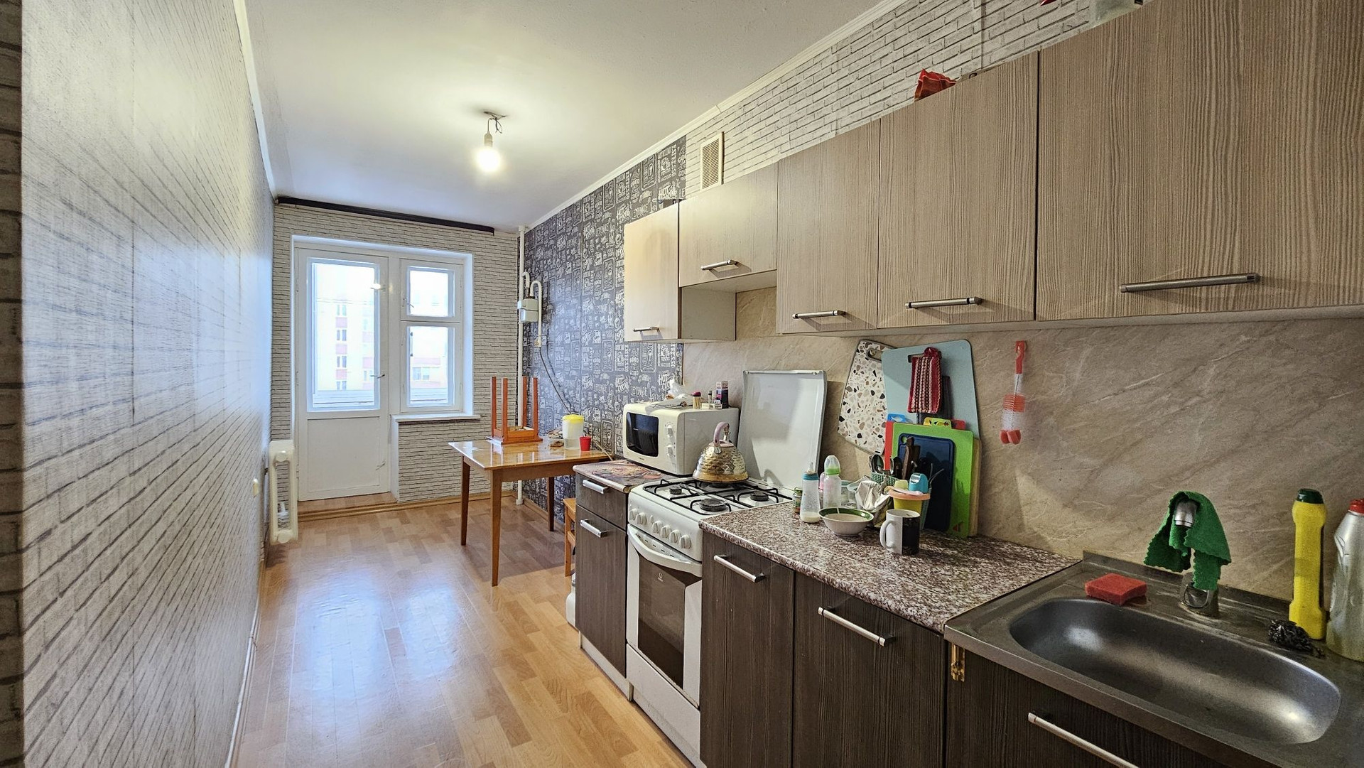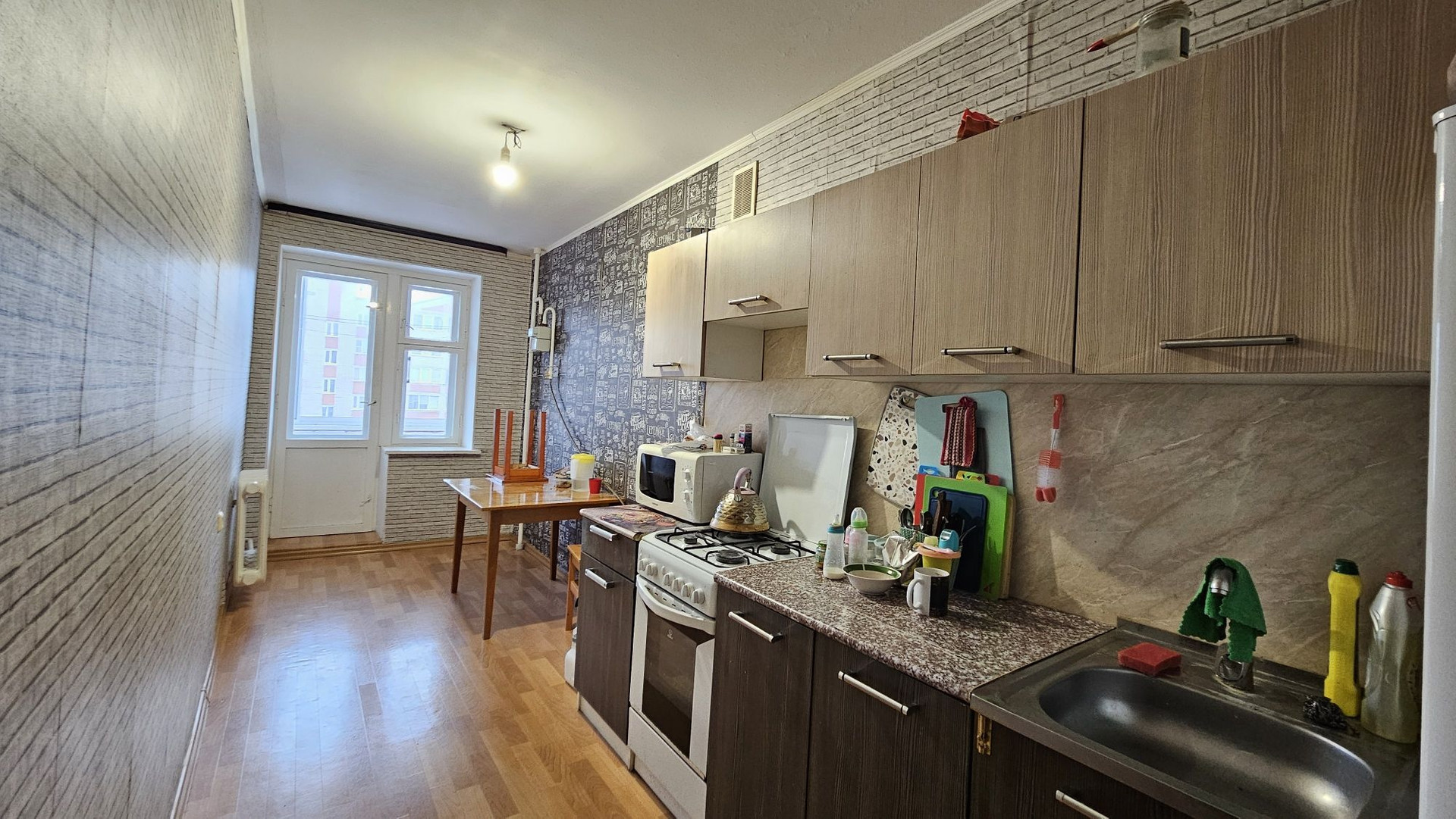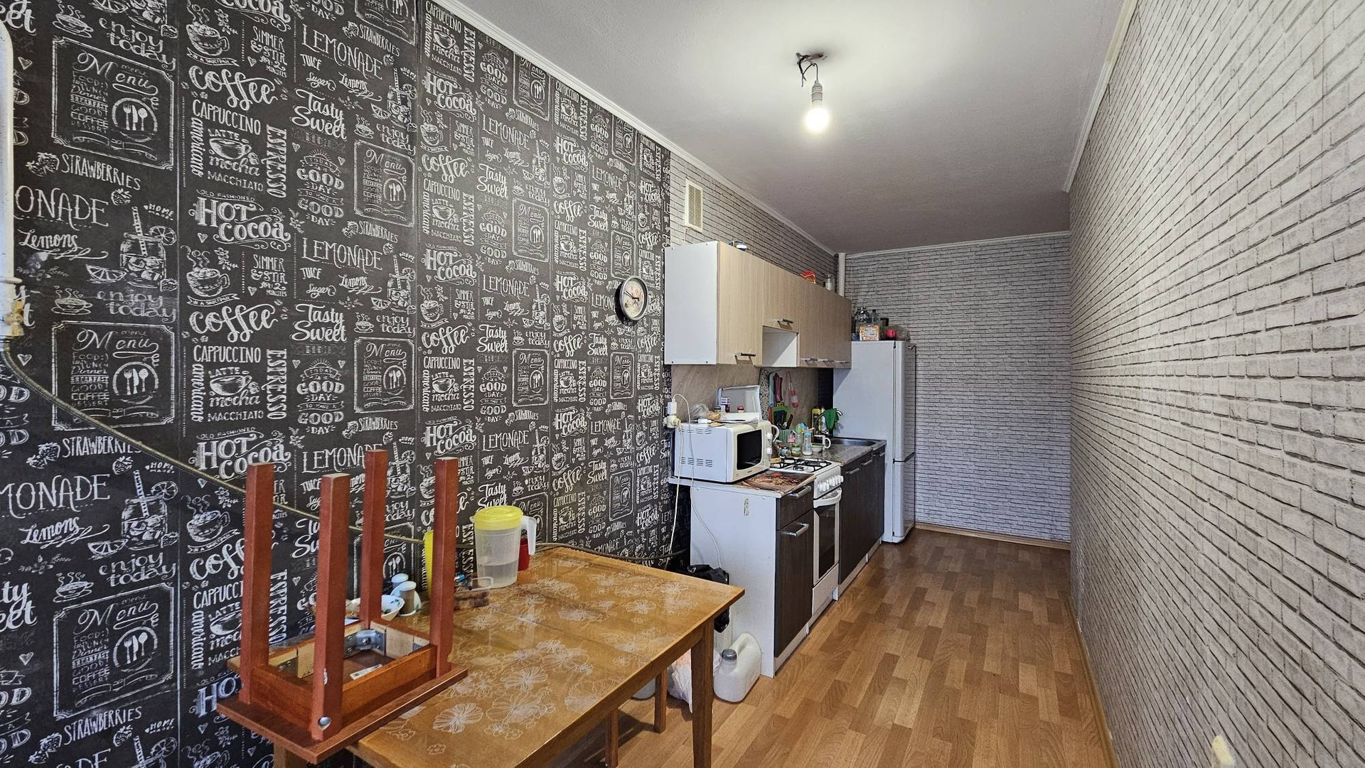 В квартире остался кухонный гарнитур, шкаф, диван. Бытовая техника: холодильник, стиральная машина. При желании можно совместить кухню с комнатой и у Вас получится просторная кухня-гостинная.