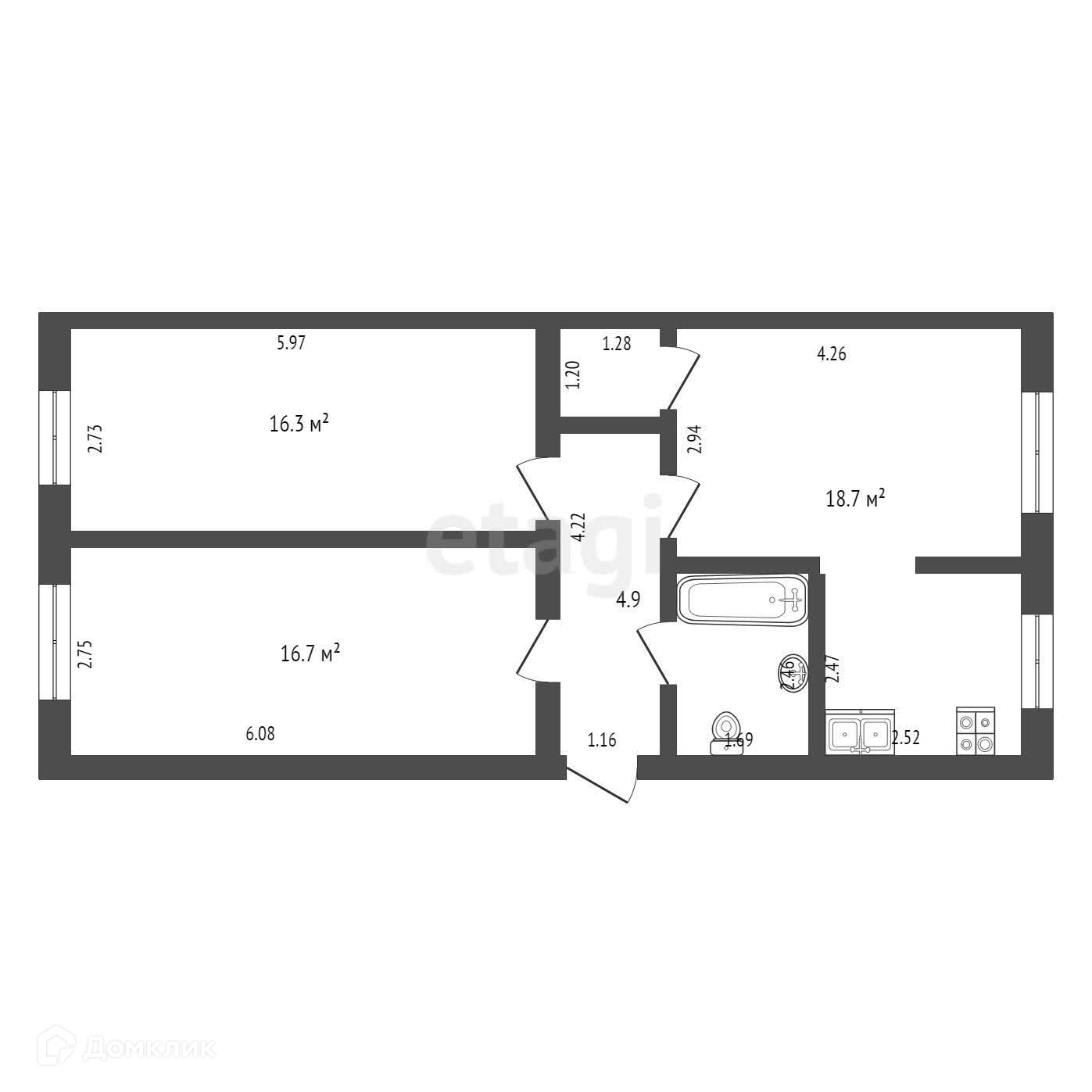 Квартира состоит из двух изолированных спальных комнат: 16,3 кв.м и 16,7 кв.м и большой кухни - гостиной.