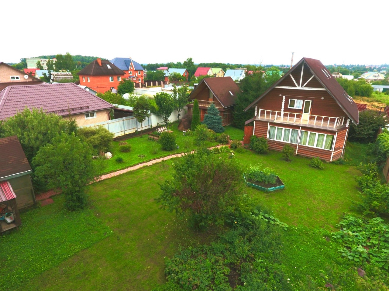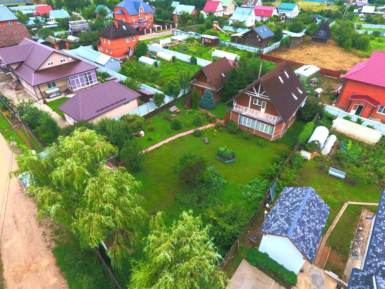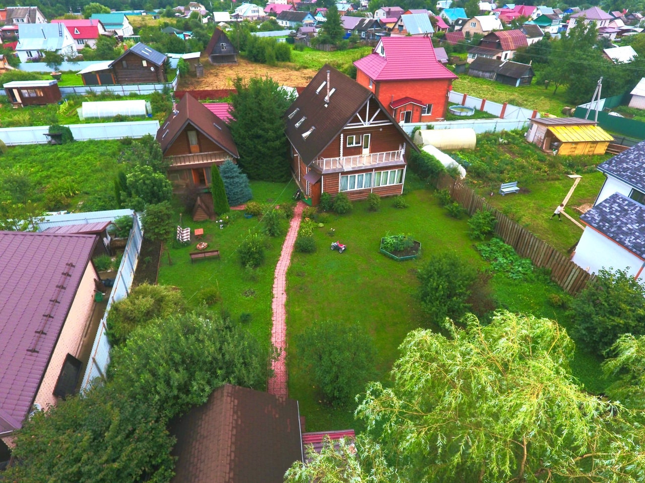 Засеян газоном, на участке зона отдыха с костровой зоной, качели, много красивых деревьев: Туи, голубая ель. На участке так же имеется гараж под один автомобиль.
