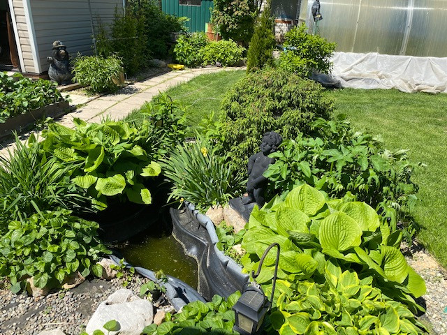 Ландшафтный дизайн (туи, газон, орех маньчжурский, глициния, пионы красный/розовый/белый/желтый, флоксы, жасмин, сирень, клематис, лилии, форзиция, гортензия, японская айва, рододендроны, лапчатка)