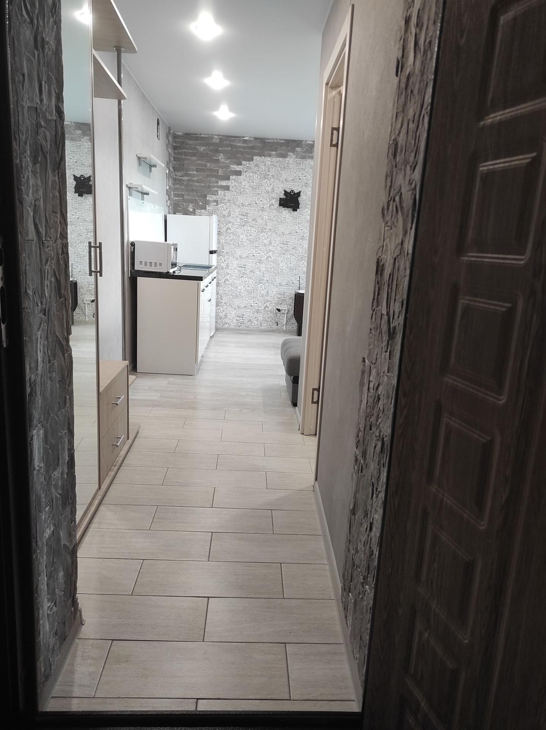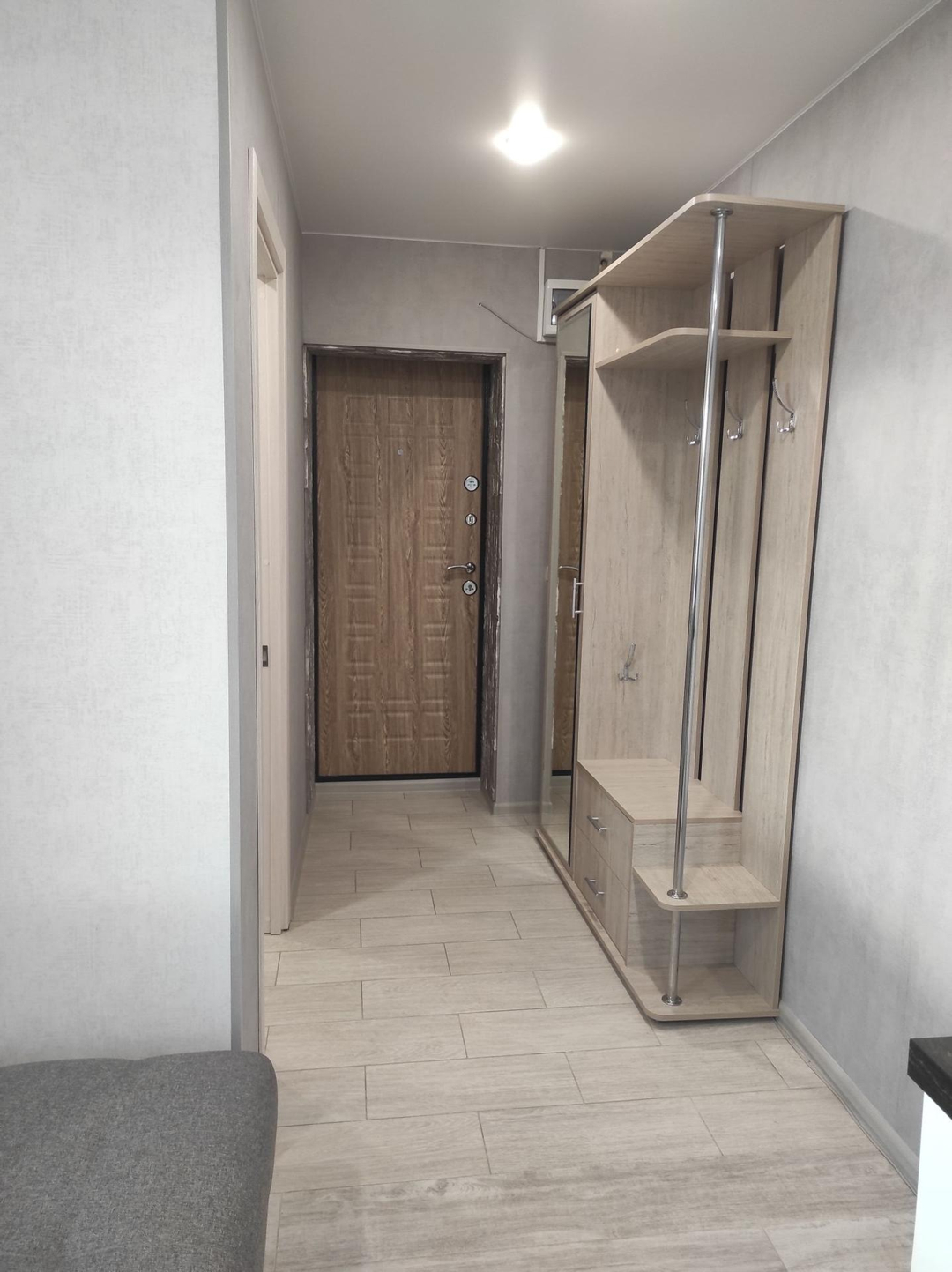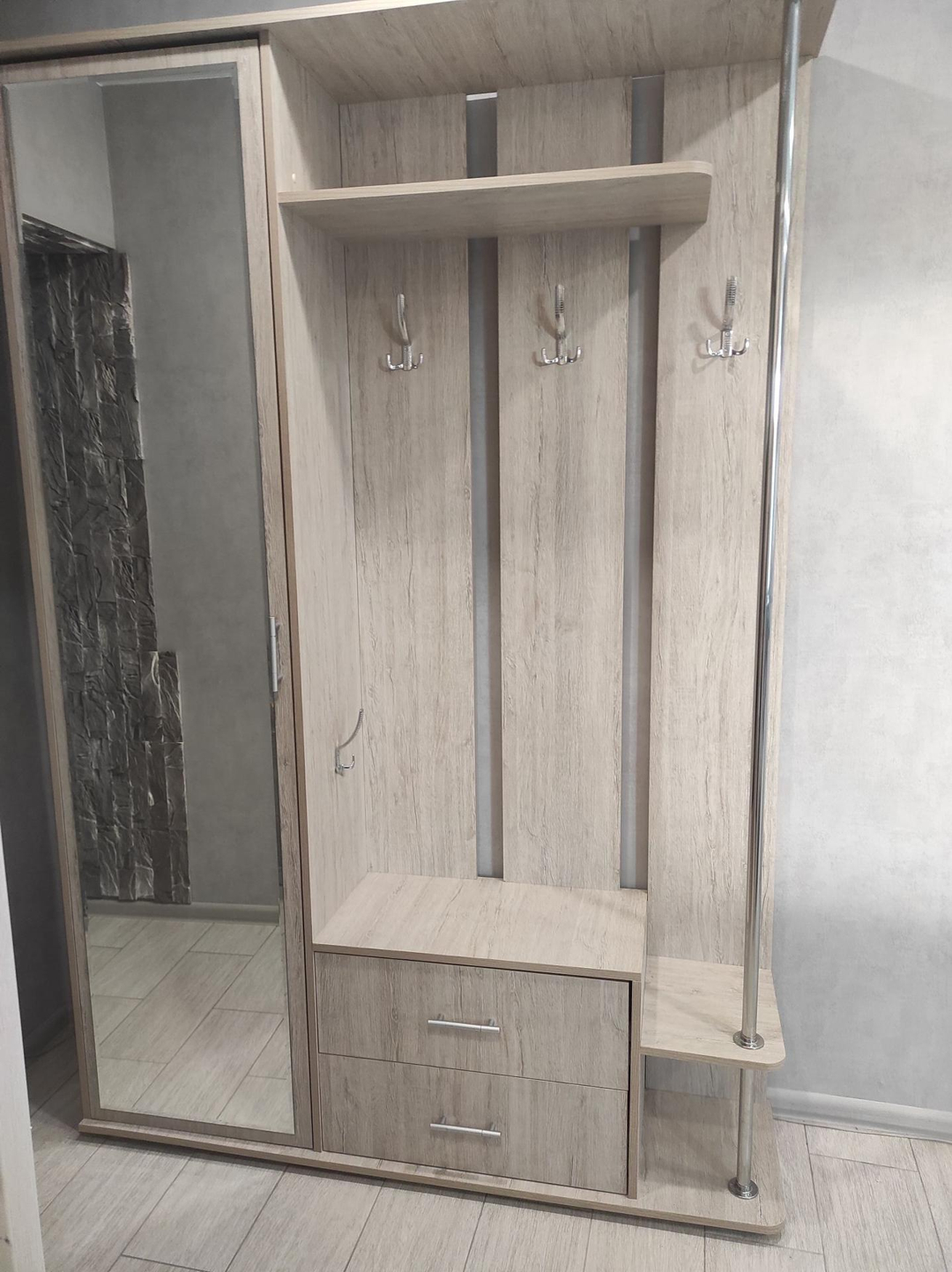 Прихожая для хранения вещей и верхней одежды с большим зеркалом.