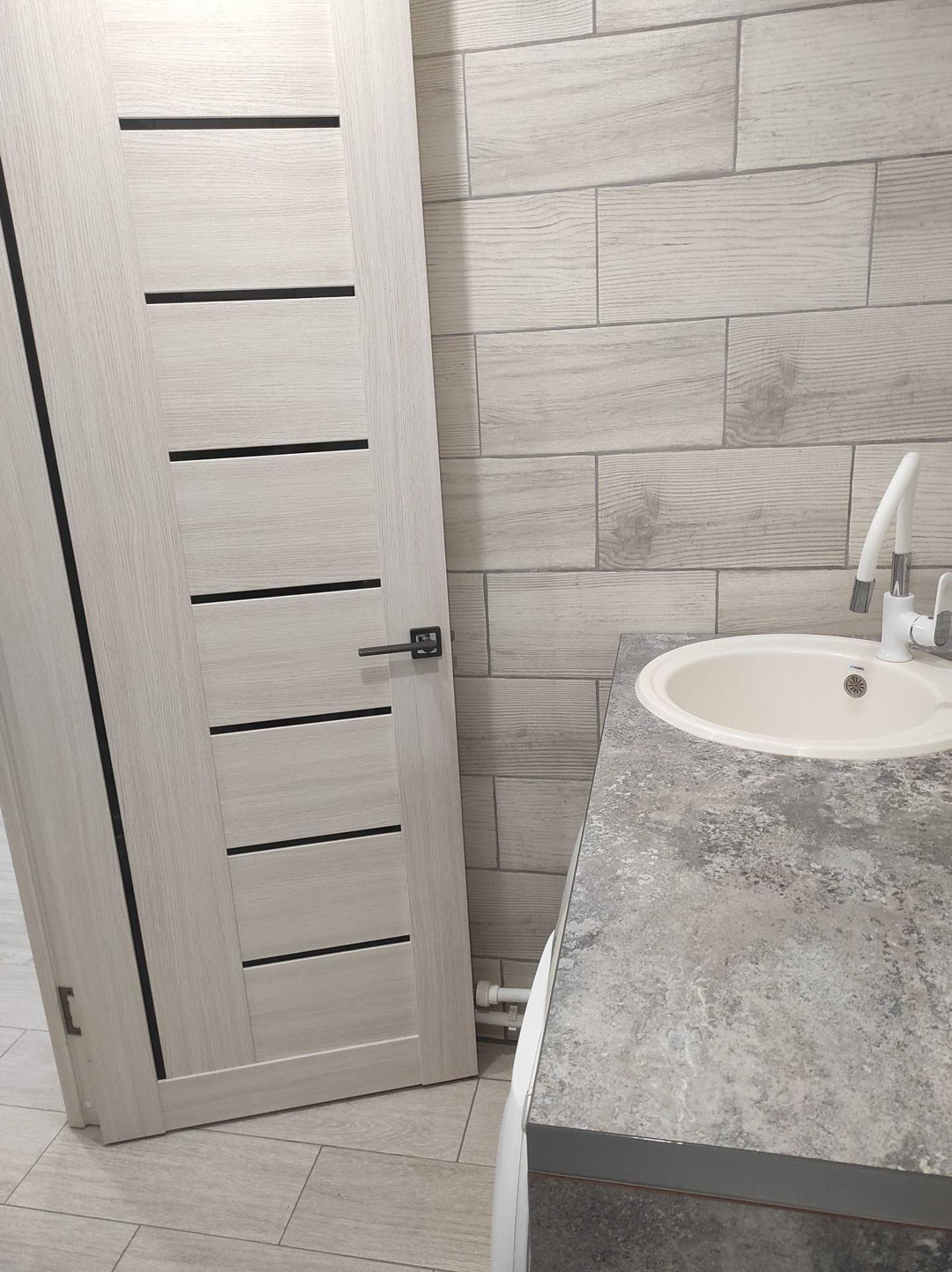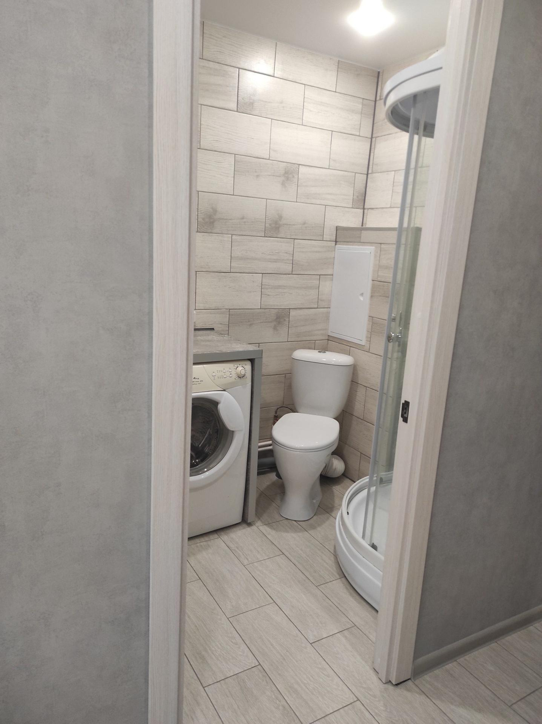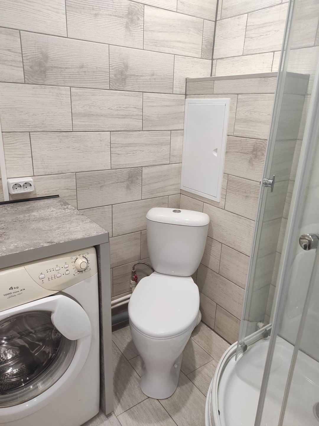 Туалет, душевая кабина, столешница со встроенной раковиной, стиральная машина).