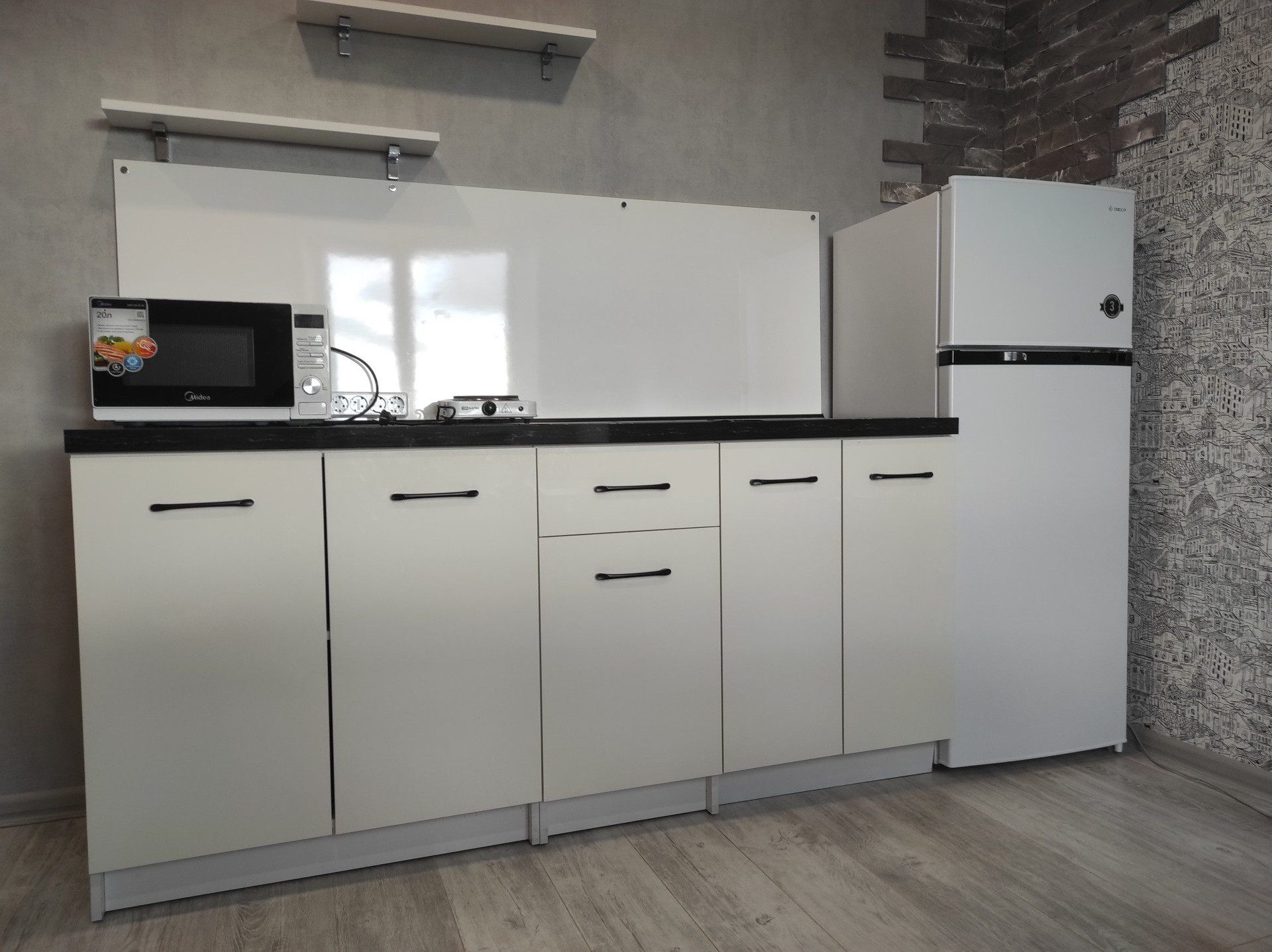 (Микроволновка, холодильник и электрическая плита)