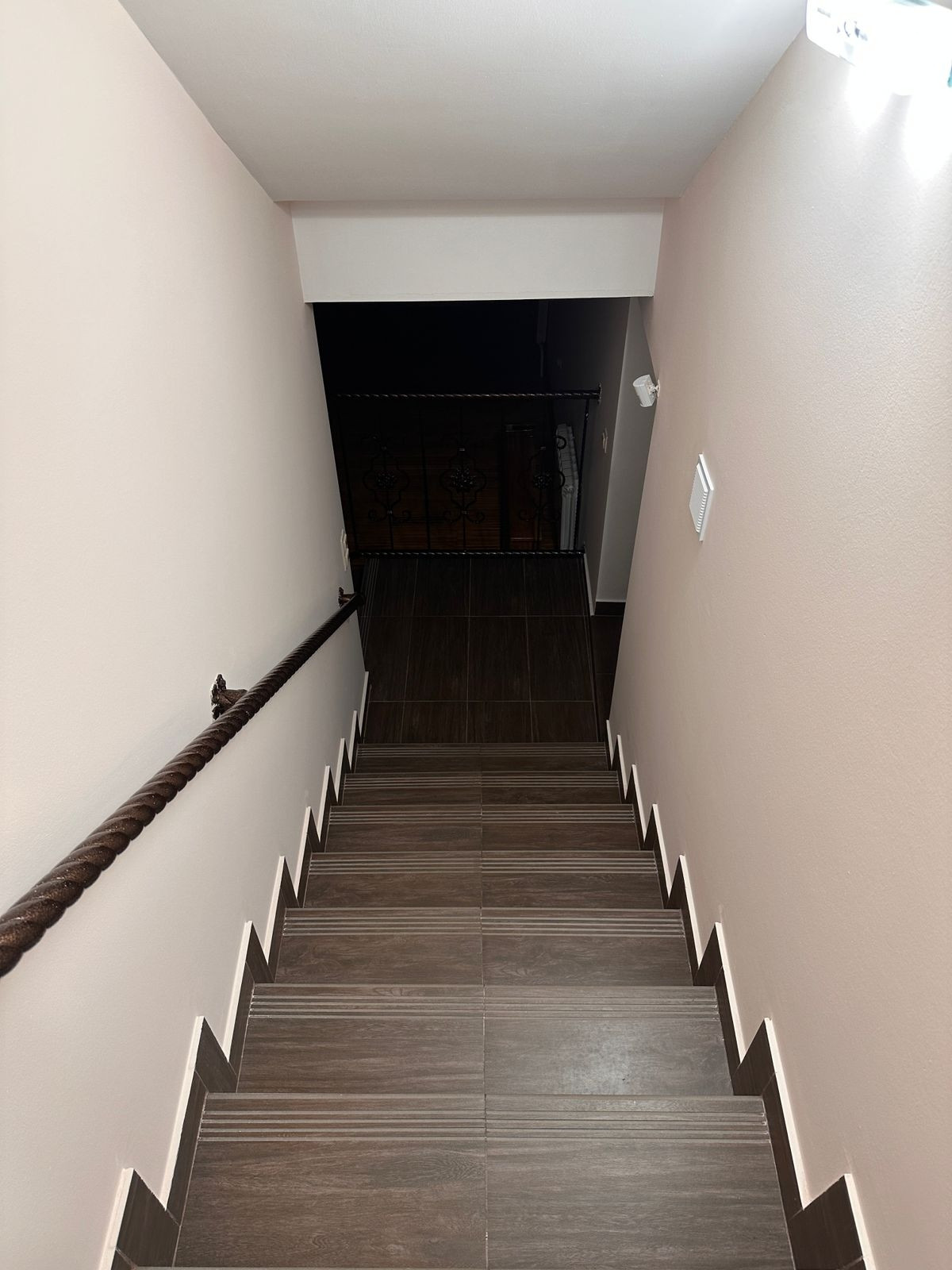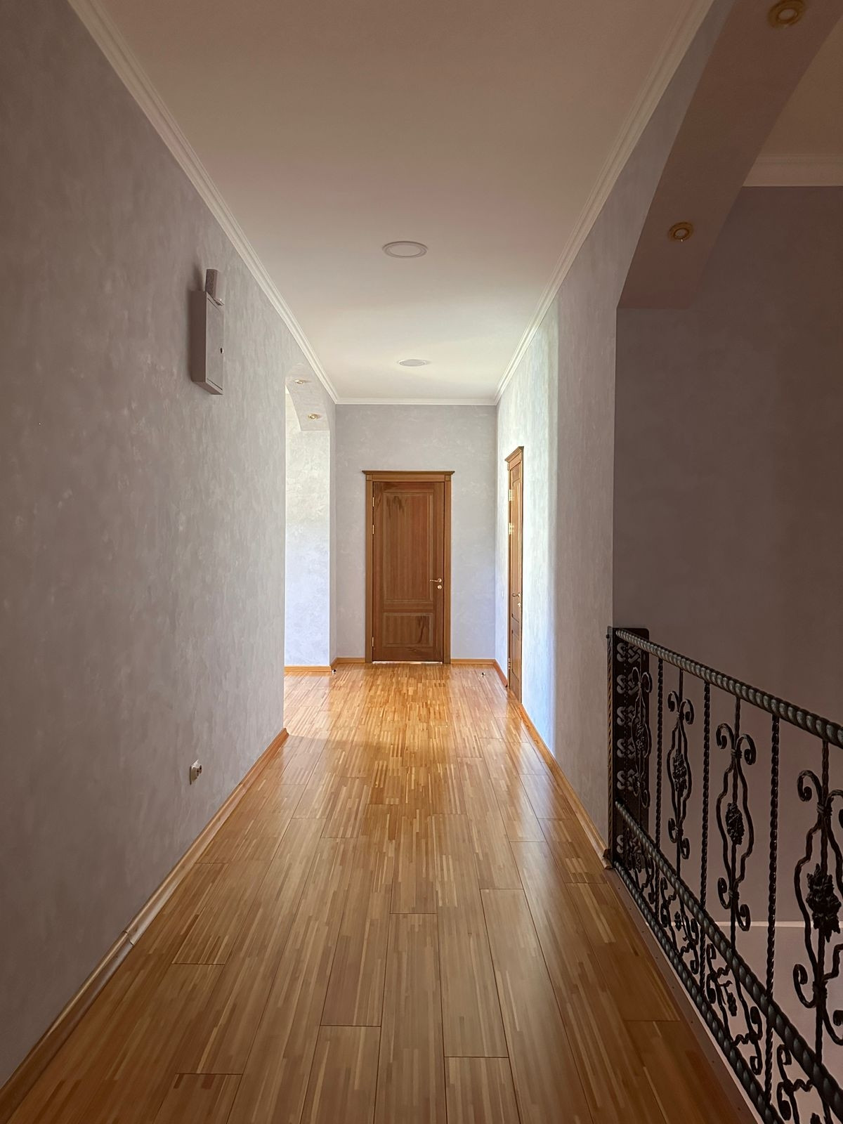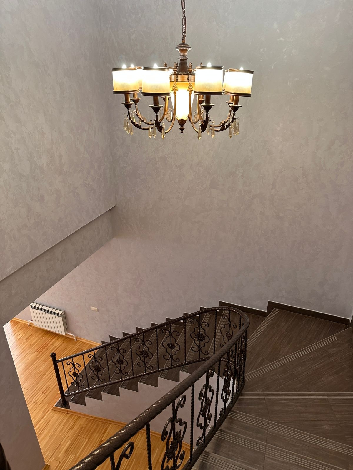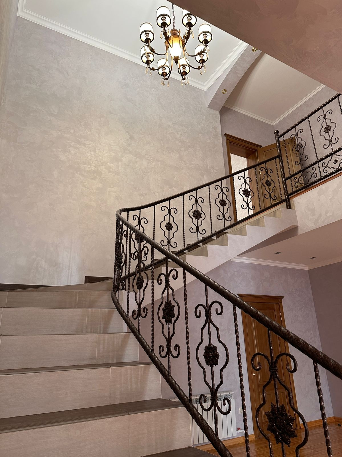 Подъем на 2 эт. по оригинальной винтовой лестнице с перилами из кованного металла. Уклон лестничной конструкции безопасен, удобен ,прочен. Диапазон ступенек комфортен.